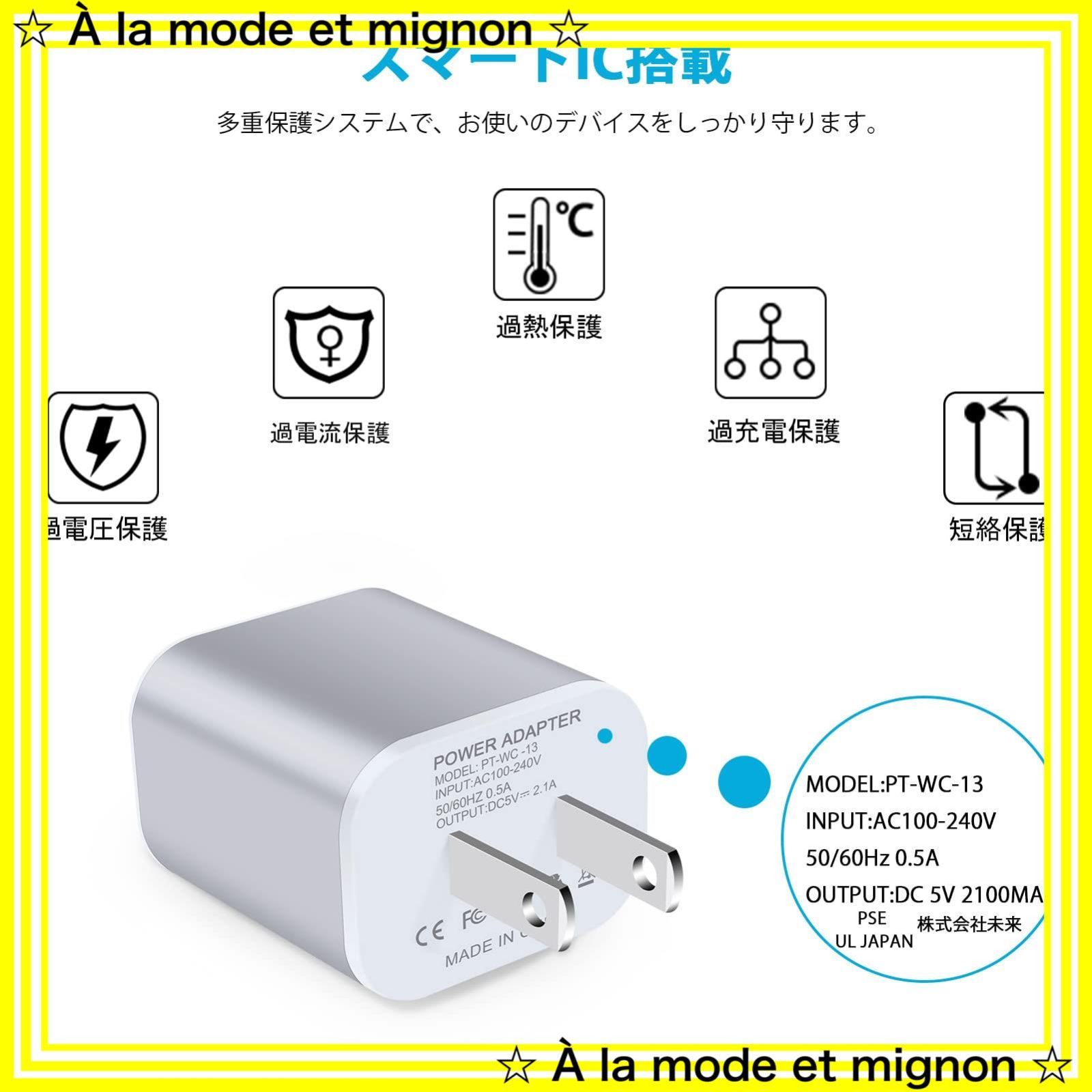【2台同時に充電】家庭用コンセントからスマートフォンやタブレットを充電できるAC充電器です。USBポートを2個搭載しているので、スマホやiPhoneなどのUSB充電に対応した機器を、同時に充電することが可能です(2ポート合計最大2.1A以内)。USBポート出力自動判別機能「Smart USB System」搭載で、機器に合わせた最大出力で急速充電が行えます。ご注意:本製品普通の5w充電器より2倍ぐらい速く充電できますが、QC3.0に対応できないので、急速充電マークを表示されない可能性があります。また、2ポート同時使う時は、通常のスピートとなります。