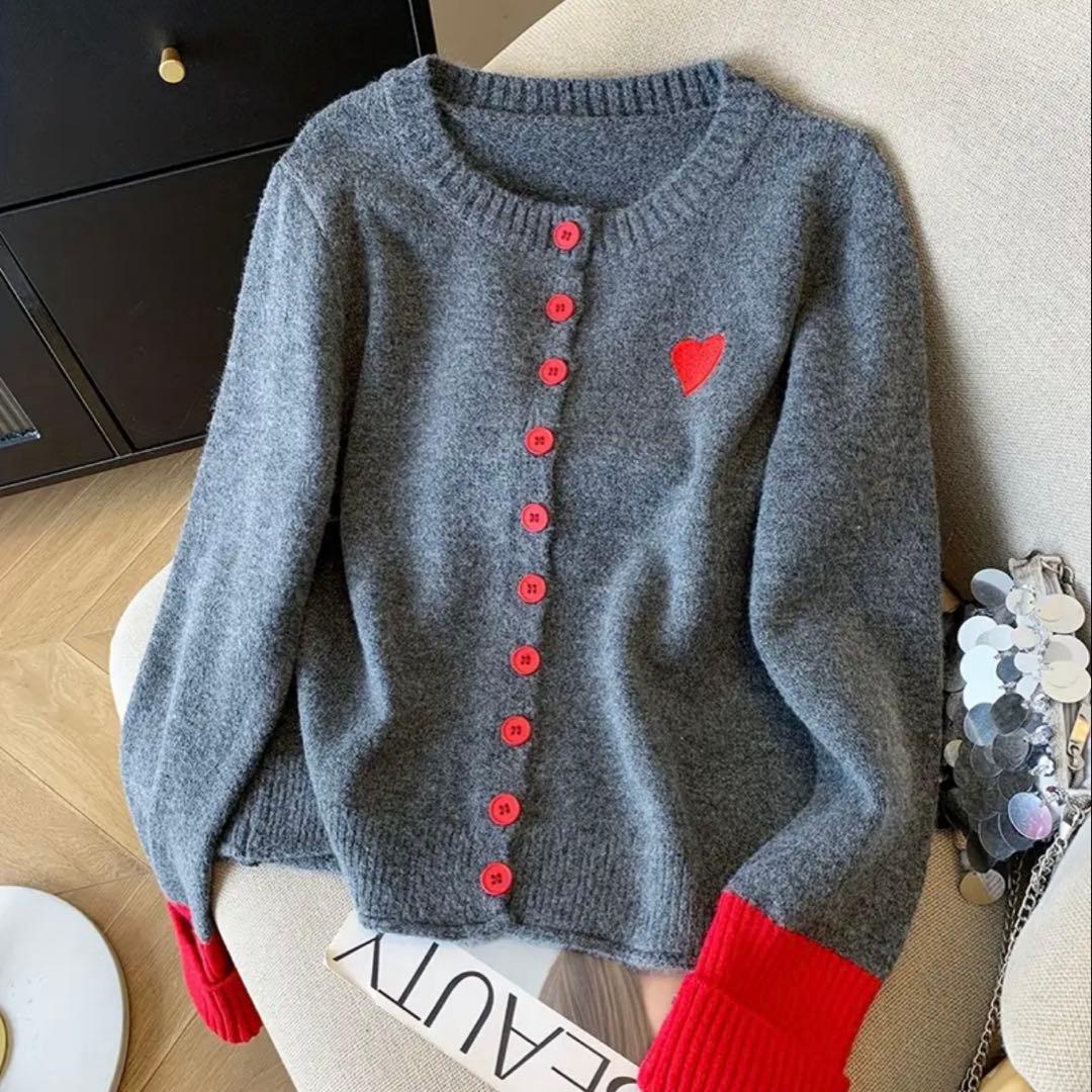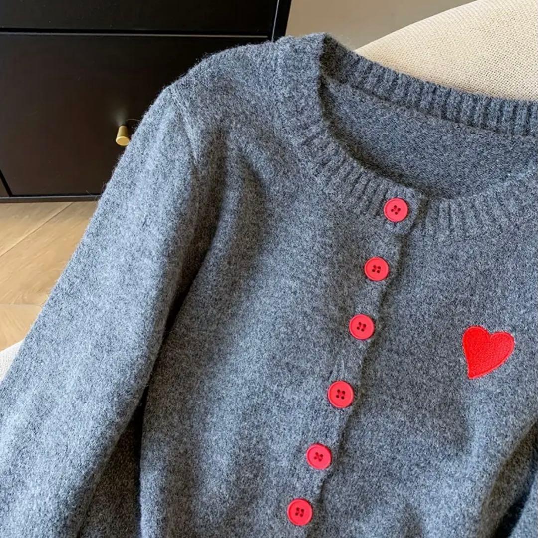 ハート ラウンドネック カーディガン 新品未使用 グレー レッド 赤