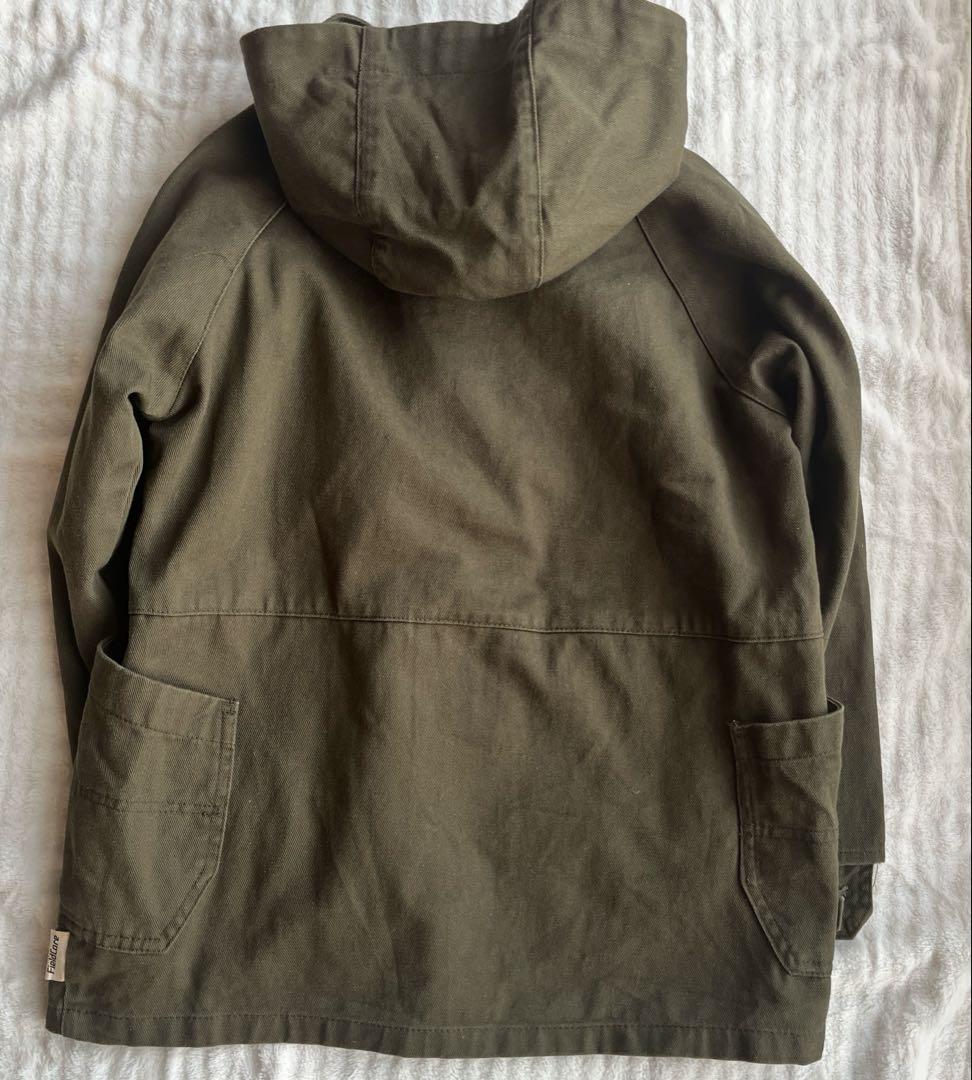 オリーブ色のフード付きコットンジャケット、前面に大きなポケット付き。 - 色: オリーブ - デザイン: フード付きジャケット - ポケット: 前面に大きなポケットあり - ボタン: 前面ボタン留め - 生地: コットン素材 ご覧いただきありがとうございます。