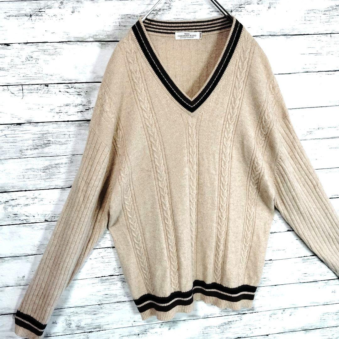 美品【カシミヤ】チルデンニット ケーブル編みセーター 大きい3Lサイズ ベージュ