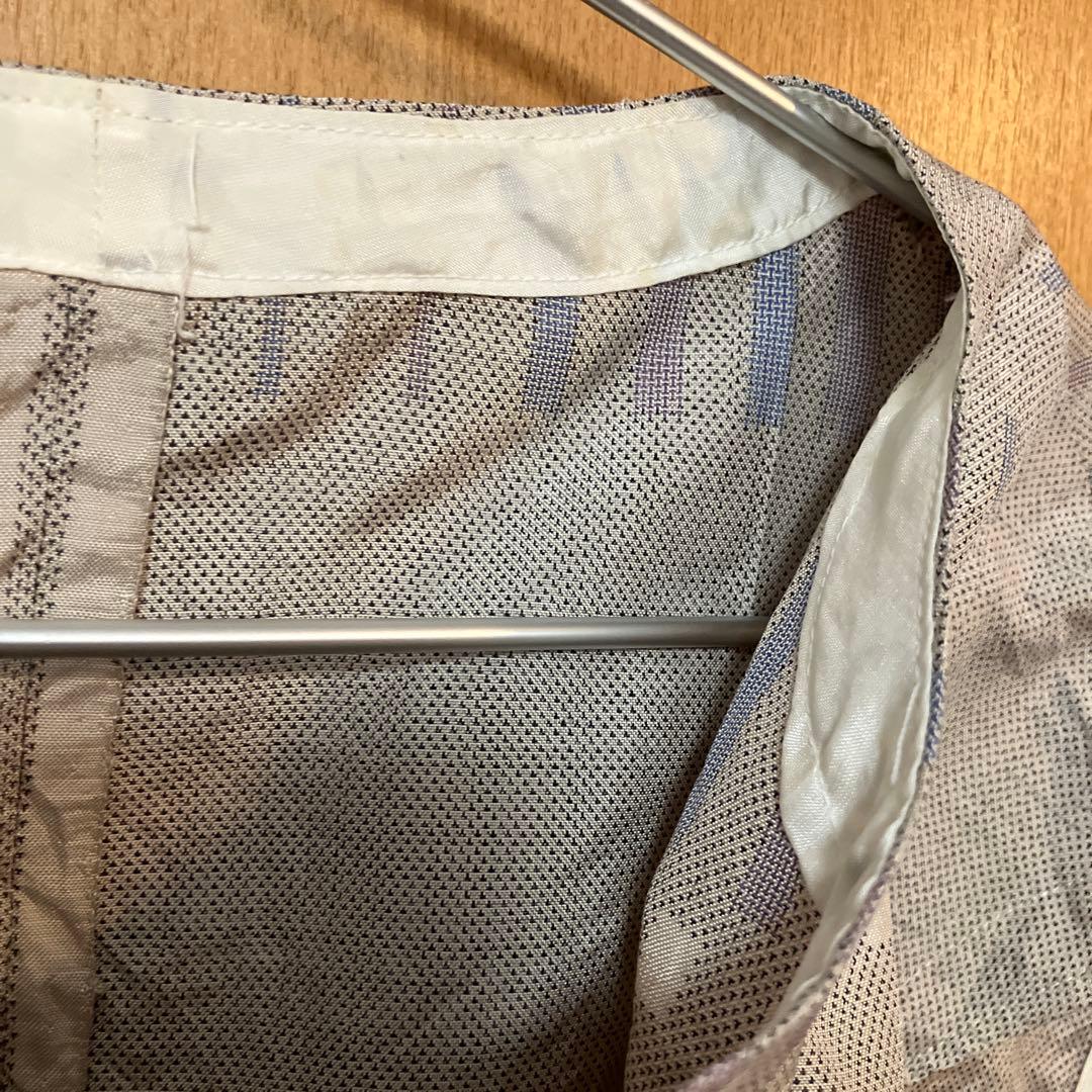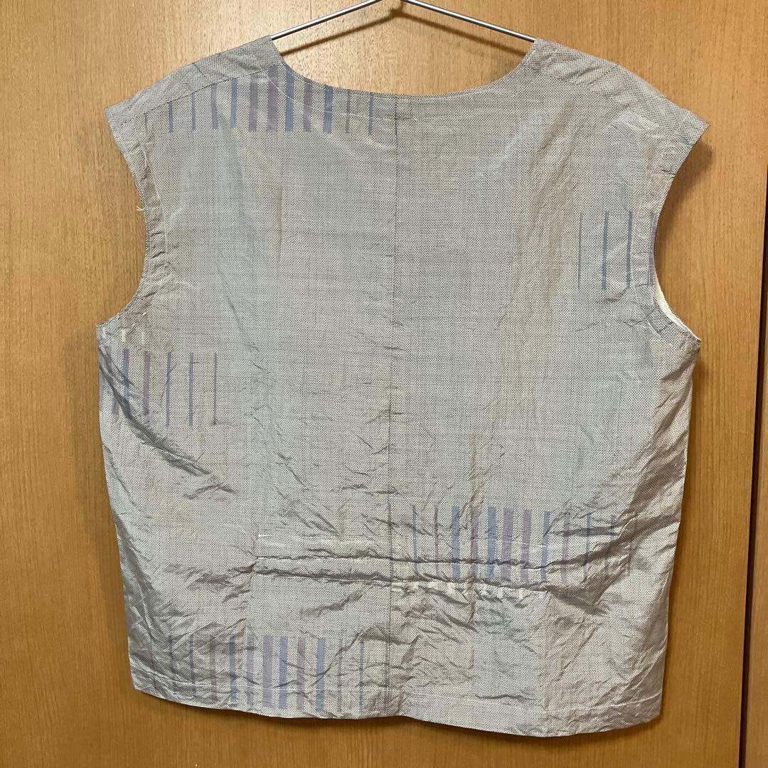 アパレル関係の仕事をしていたので、おそらく和服生地のサンプルとしていただいたものの残布を使用したものだと思います。長方形の生地を折り返してそのままブラウスにしましたので、袖はフレンチスリーブです。