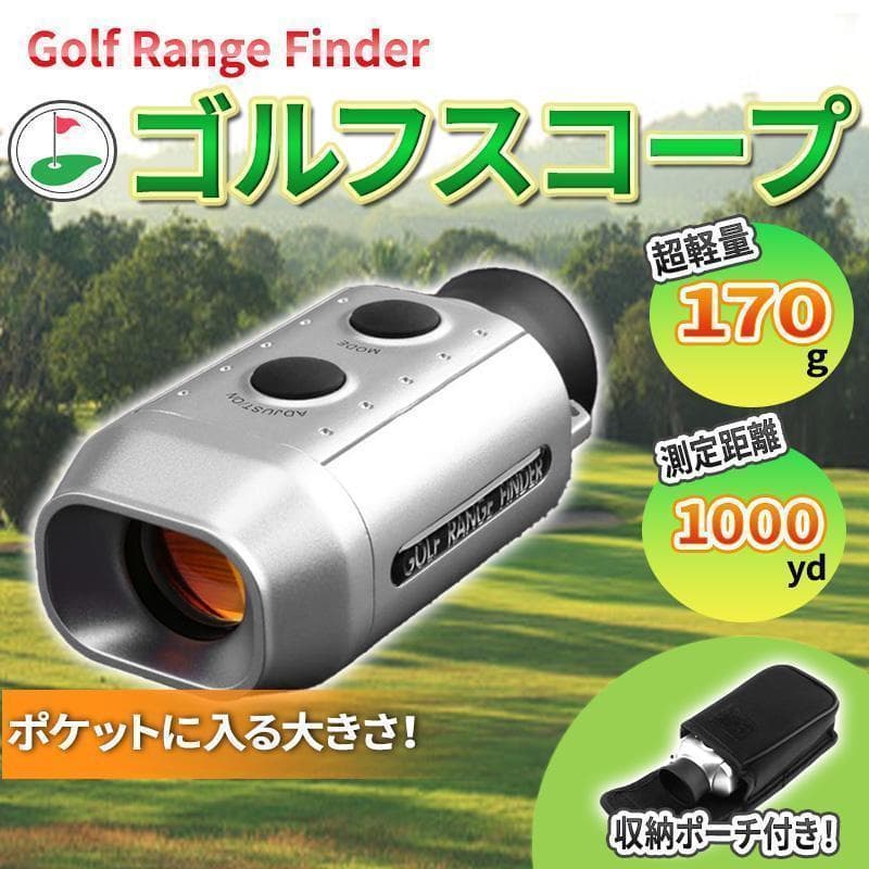 閲覧ありがとうございます。 購入後原則24時間以内に発送、最短翌日到着! ◆◇商品概要◇◆ ゴルフ用デジタルゴルフスコープです。 目標までの距離を確認でき、次に使うクラブ選びの 手助けをしてくれます。 もちろん、ゴルフ以外でも使用可能です。 次の2モードを搭載 「グリーンモード」: ゴルフ用に設定されたモードです。 ピンの高さを予め設定してあるのでボールとカップの距離を簡単に 測距することができます。 「一般モード」: 対象の高さを入力することで、あらゆる距離を正確に把握することができます。 本体は80g程度と非常に軽量の為、取り回しや使い勝手も良好です。 ※ 60秒操作が無い場合は自動的に動作終了となります。 ◆◇使用方法◇◆ 【グリーンモード】 ①アジャストボタンで電源ON (起動後はグリーンモードです) ②画面最下段の線と芝生の高さを合わせます。 ③最上段に表示されている走査線をアジャストボタンを押していき、ピンの高さ  に合わせます。 ④画面上にピンまでの距離が表示されます。 【一般モード】 ①電源オン後、モードボタンを押す。 (画面には3桁の数字と小数点以下1桁が表示されます) ②ターゲットの高さを百の位から順に設定します。  (アジャストボタンで0~9の数を変更、モードボタンで下の位の入力に移る) ③全て入力を終えたらモードボタンで決定。 ④入力した高さに応じて、画面には測定可能な最短距離が表示されます。 ⑤画面の最下段とターゲットの最下段を合わせます。 ⑥アジャストボタンを押して、走査線をターゲットの上部まで移動させます。 ⑦画面上にターゲットまでの距離を示す数字が表示されます。 ◆◇商品仕様◇◆ 【倍率】 7倍 【最高測定距離】1000ヤード(一般モード) 【電池】CR2032x2 【サイズ】90x50x38(mm) 【重さ:】約100g 【内容】本体、電池、ストラップ、ケース、レンズクロス、マニュアル(英語) ※簡易梱包にて発送となります。 ※商品不良の際は受け取り評価前にご連絡下さい。 2558