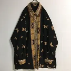 90s〜00s 韓国古着 蝶々柄 ポリシャツ 長袖 古着女子XL相当 黒 茶