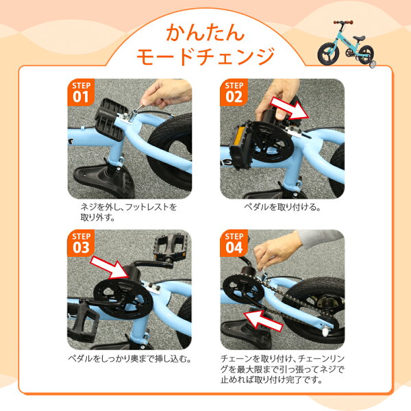 補助輪を外して自転車へお子様の成長に合わせて3段階の変形ができます。