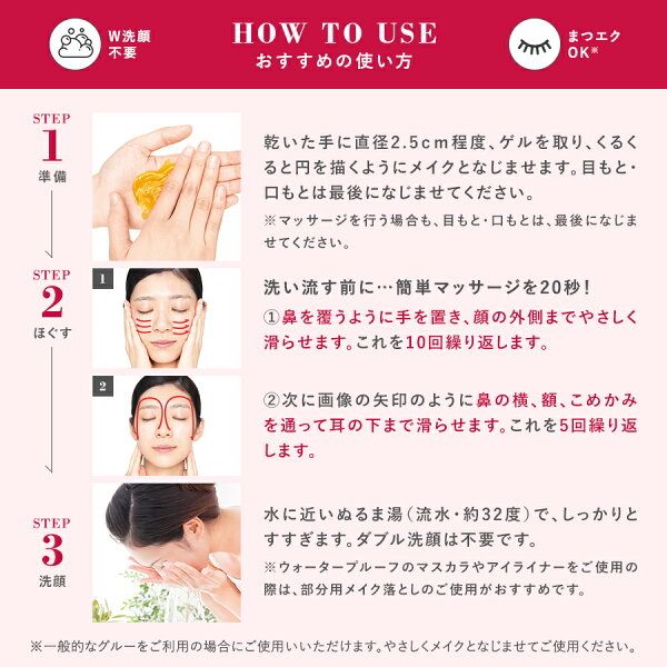 ウォータープルーフのマスカラやアイラインは〈ホットクレンジングゲル〉では落ちにくい場合がありますので、専用リムーバー〈アイリムーバージュレ〉をご使用ください。