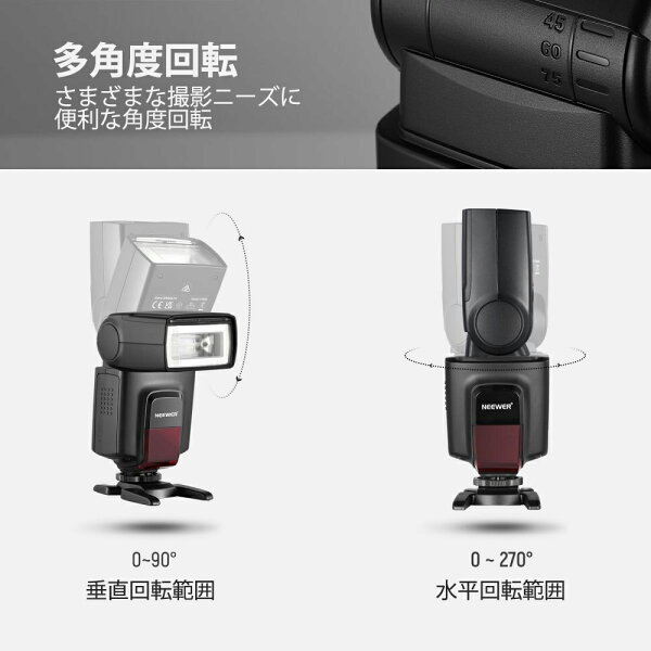 【強いカメラフラッシュ スピードライト】垂直回転角度:0~90度。