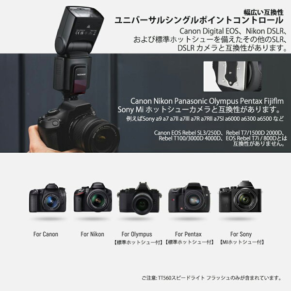 幅広い互換性: 単一接点ホットシューを備えており、標準シューを備えたCanon Nikon Panasonic Olympus Pentaxカメラと互換性があります。