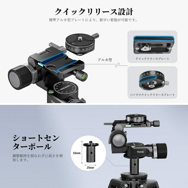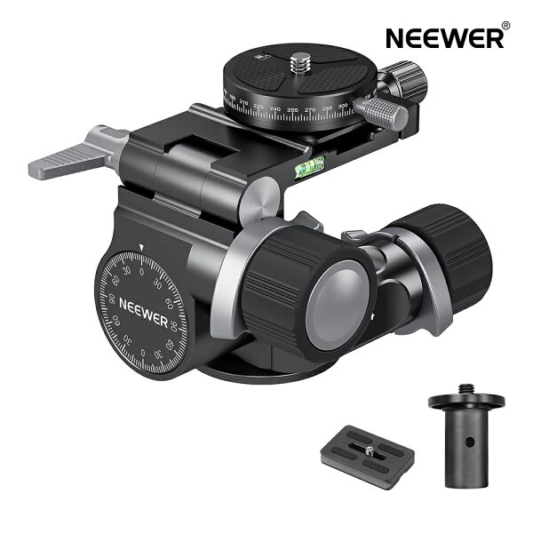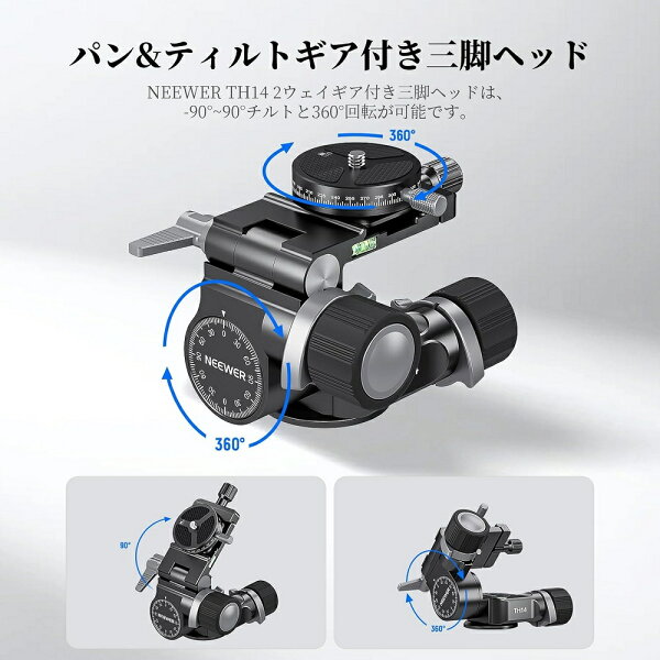 【パン&チルトギア付き三脚ヘッド】●NEEWER TH14 2ウェイギア付き三脚ヘッドは、-90°から90°までチルトと360°回転が可能で、360°パノラマクイックリリースプレートは、より柔軟なカメラポジションが可能です。