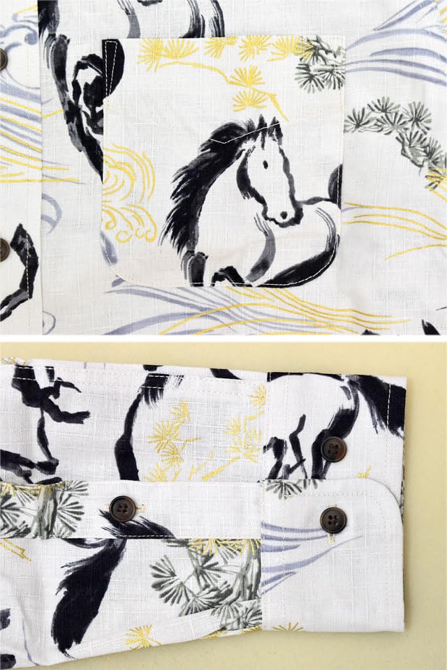 | モデル: | 長袖レギュラーカラーシャツ「金彩墨絵馬」◆衣櫻 |
