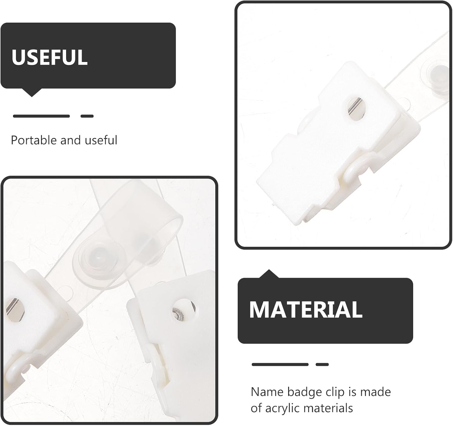 バッジホルダークリップIDカードや名前バッジを整理し、仕事のバッジを便利に表示するのに役立ちます。バッジホルダーバッジクリップはアクリル素材で作られており、精巧な仕上がり、軽量で丈夫、使いやすく、シンプルなデザインで、多くの利便性を提供します。