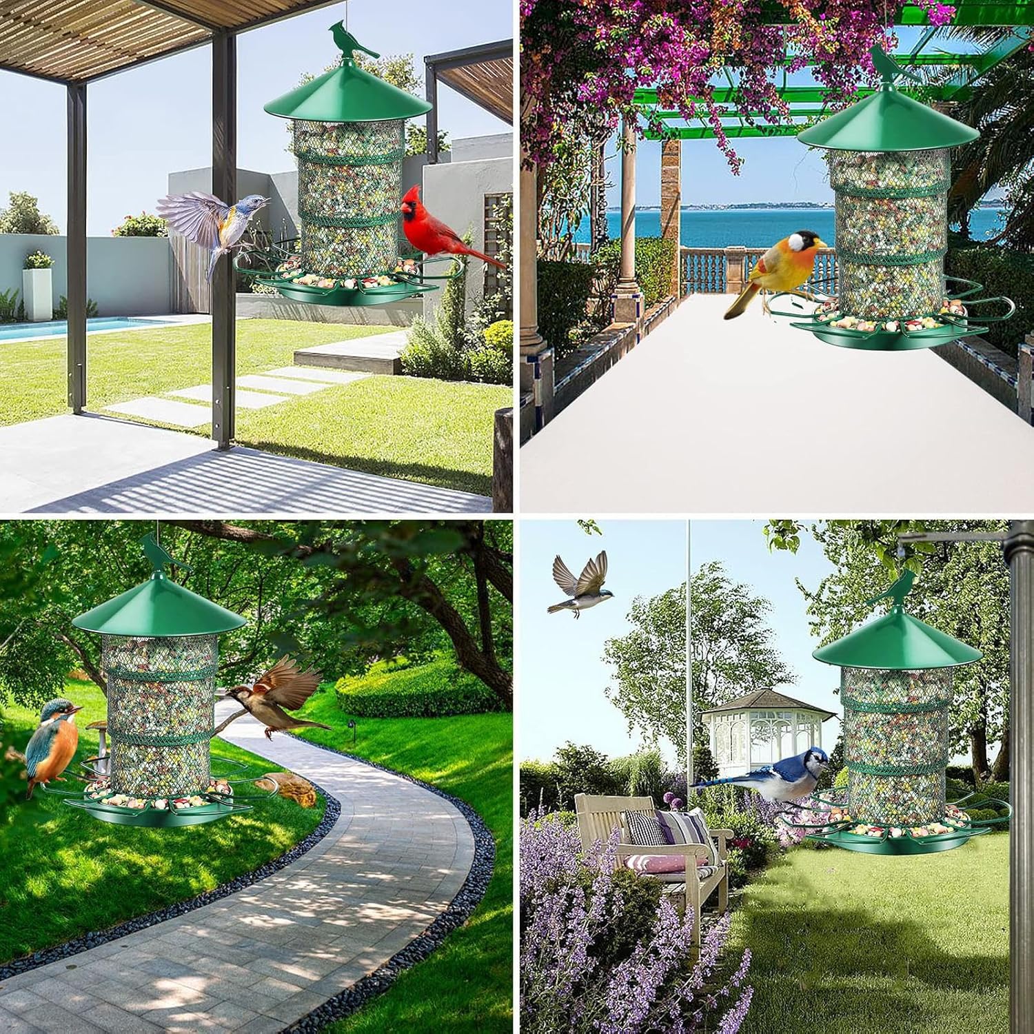 耐久性設計のフィーダー: 防水コーティングと耐候性構造を採用した全天候対応の鳥用フィーダー。雨・日光・風に強く、リスが餌口にアクセスできない設計で、年間通じて庭や裏庭に設置可能。鳥が安全に食事を楽しめる環境を提供し、自然観察に最適です。