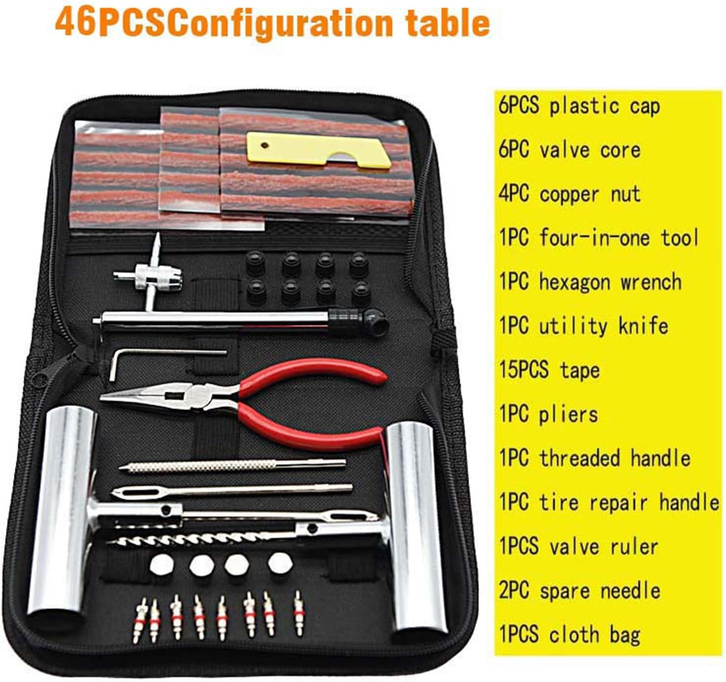 - 効果的なパンク修理: 46点の工具セットには、効果的な路上タイヤ修理に必要な全てのコンポーネントが含まれており、ドライバーは漏れを迅速に対処して遅滞なく旅を続けることができます。予期せぬタイヤ損傷のシナリオに最適です。