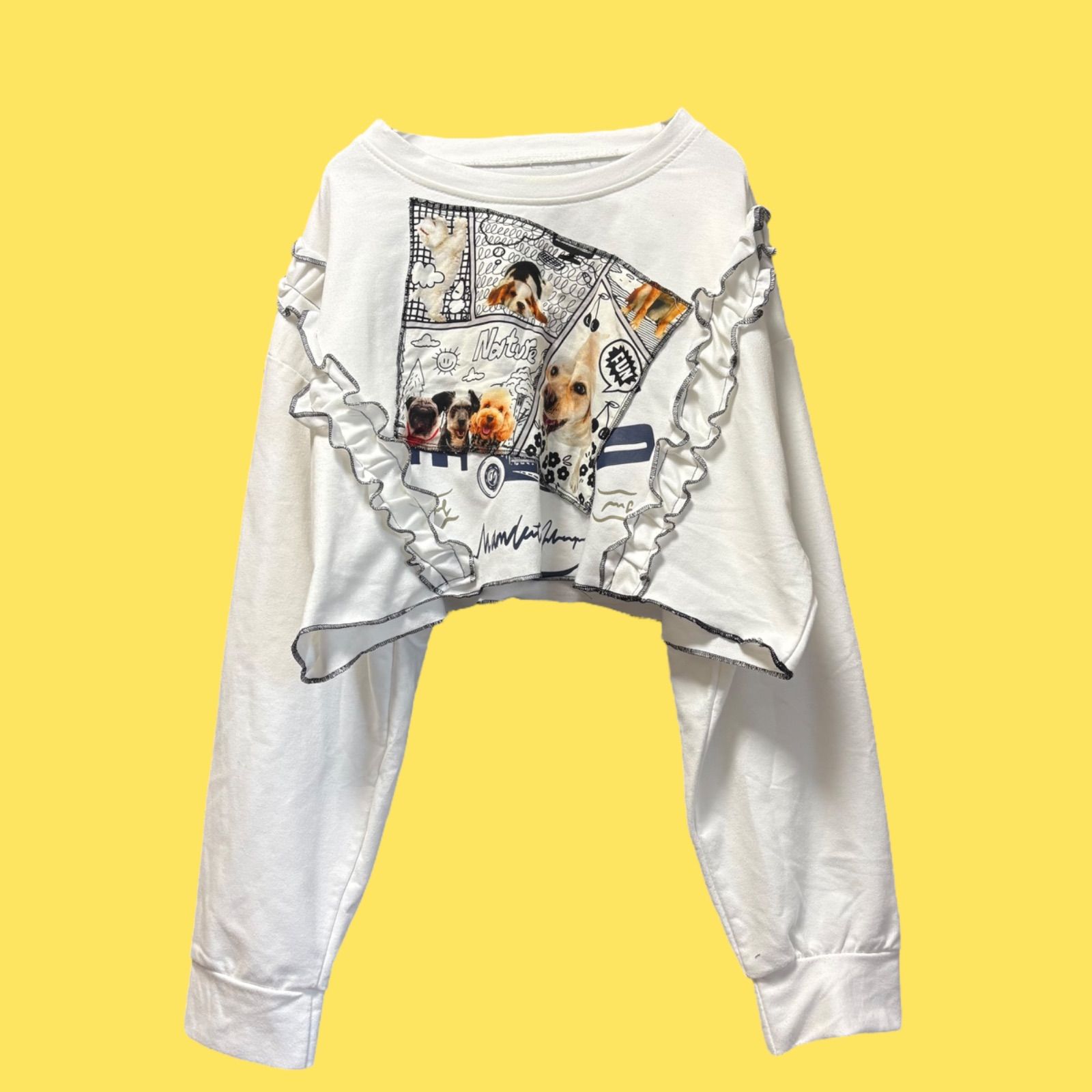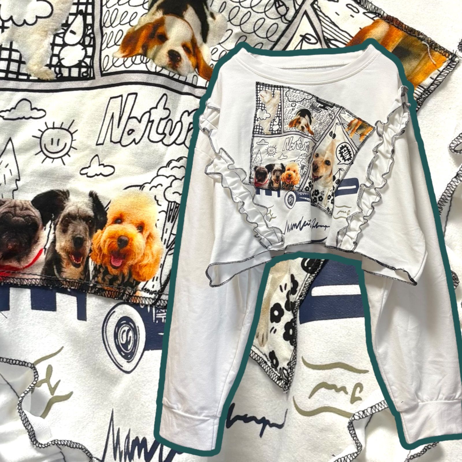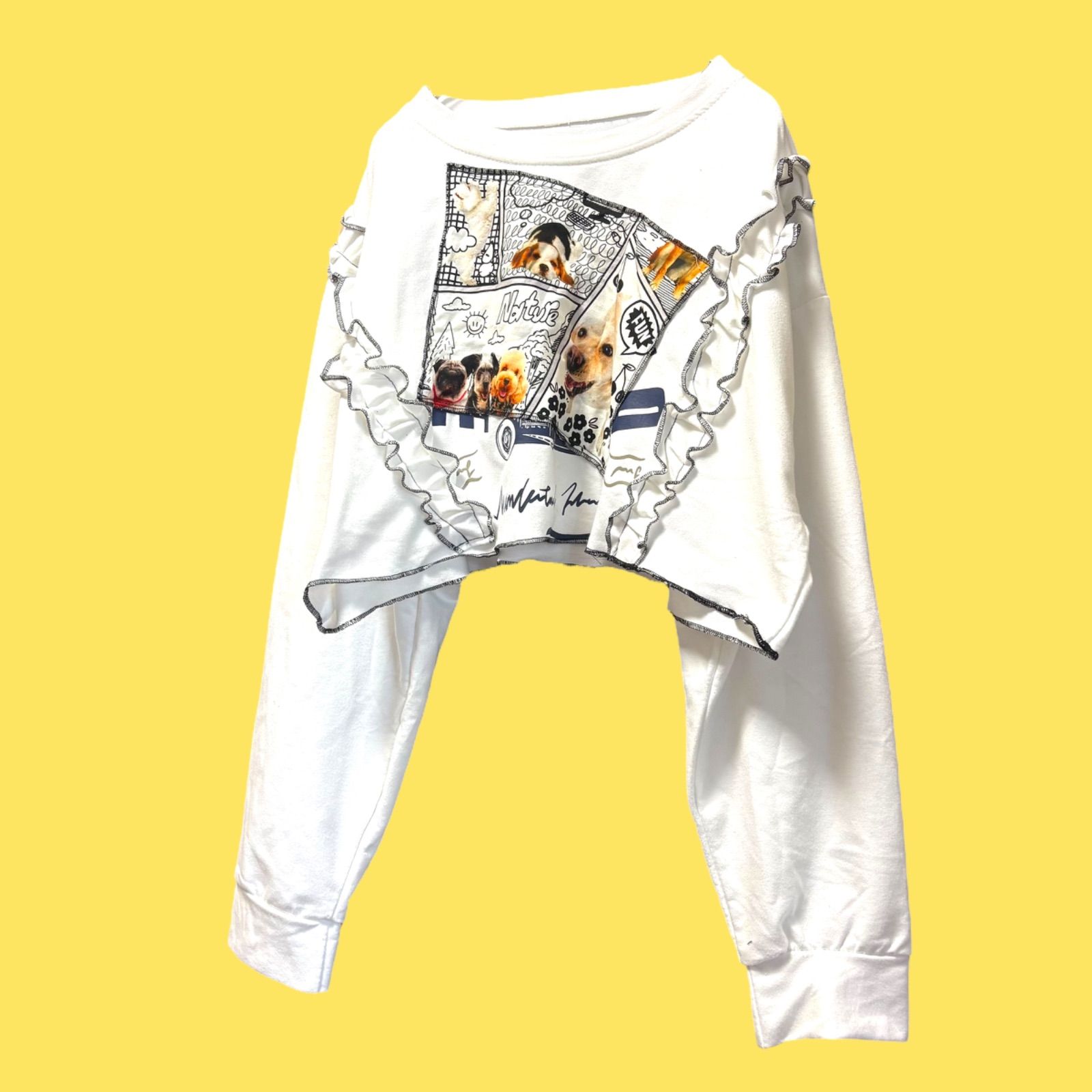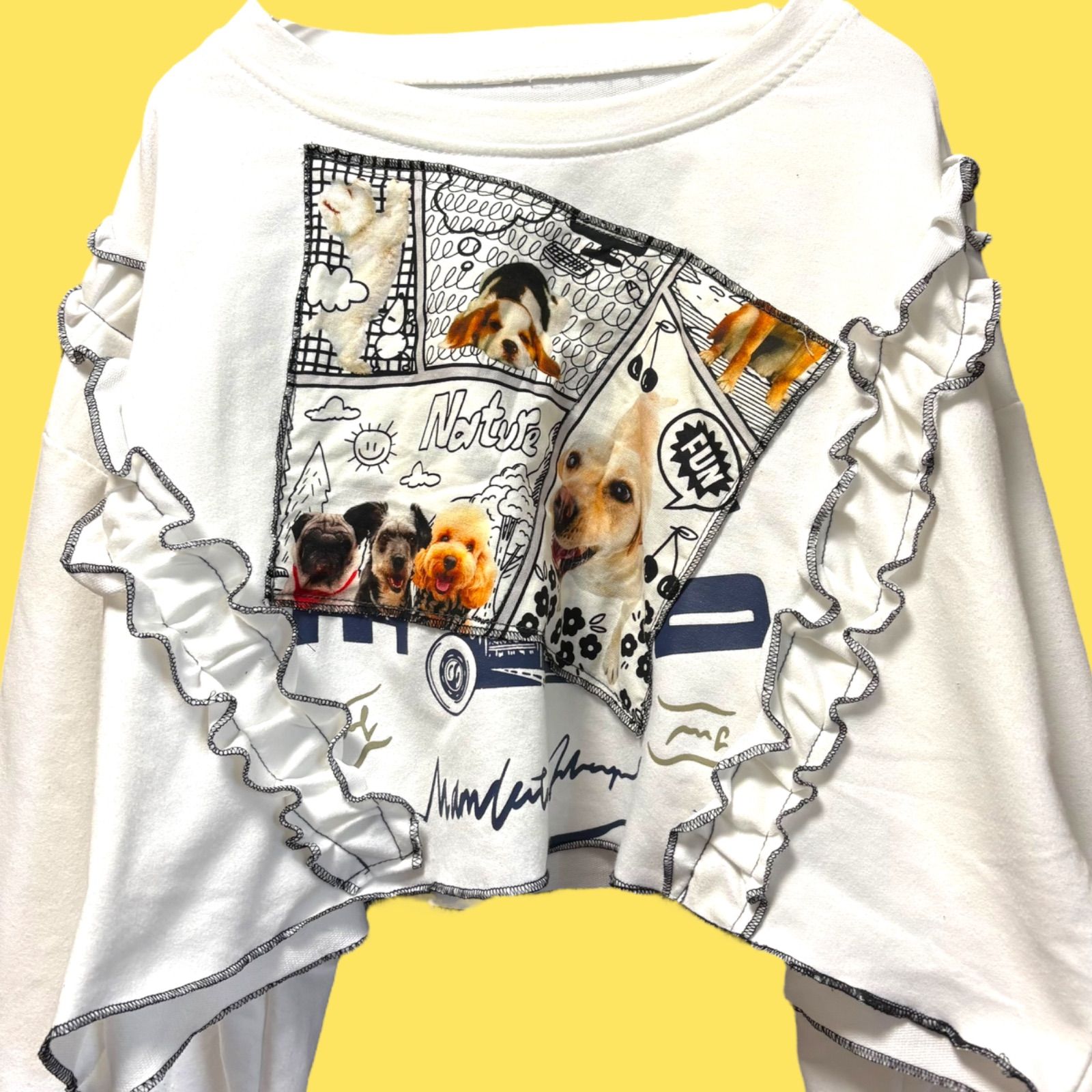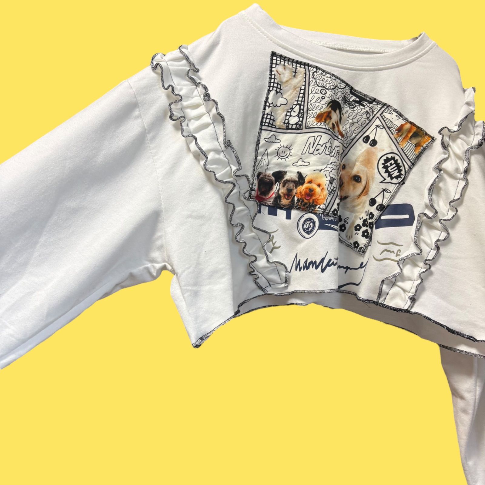 アウトレットセール✨L✨短いトップス 重ね着ショート丈✨古着リメイク 犬プリント フリル Tシャツ長袖ロンT クーポンあり