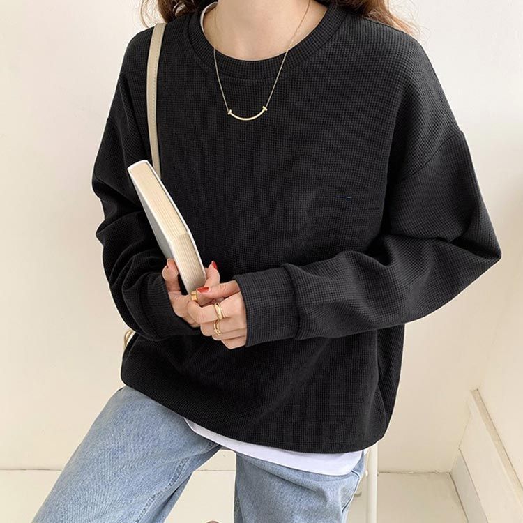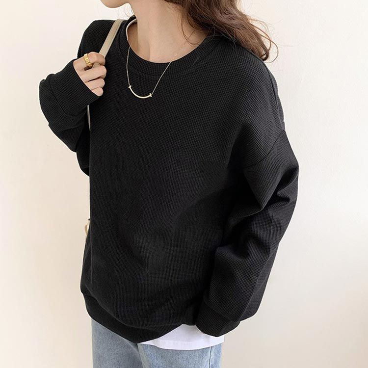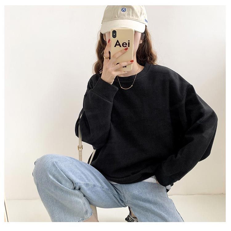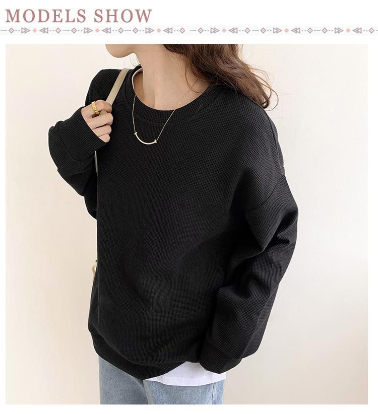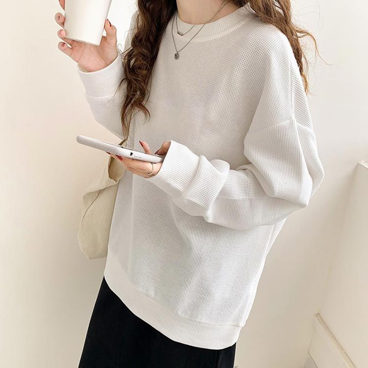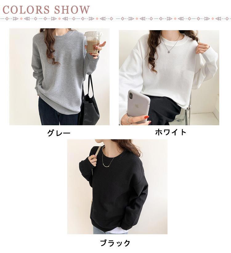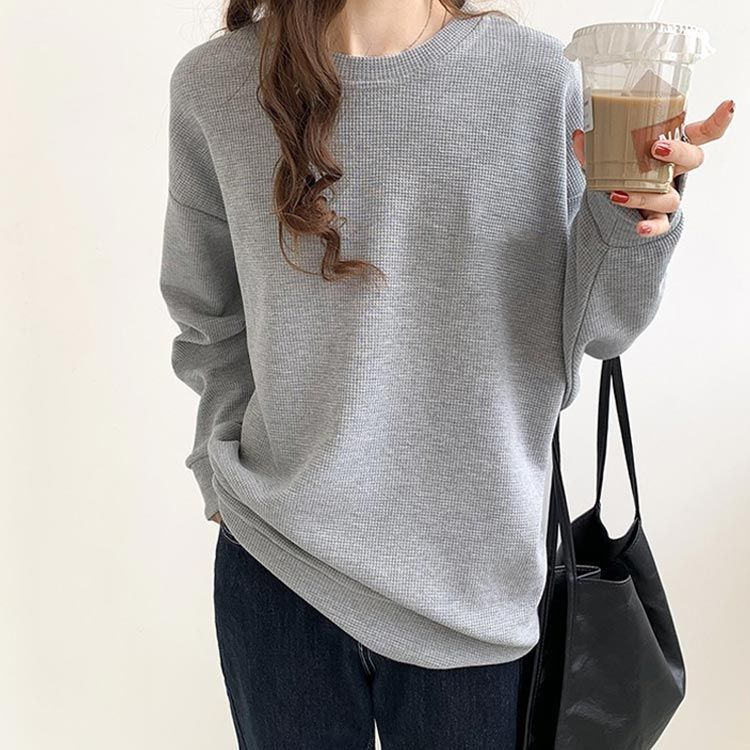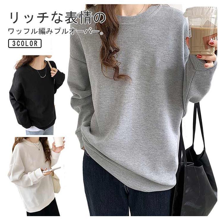 送料無料 ワッフル Tシャツ ゆったり 長袖 プルオーバー トレーナー スウェット トップス 丸首 無地 ドロップショルダー ロンT 20代 30代 40代 春 秋 ワッフル生地 カットソー 大きいサ#yojf555