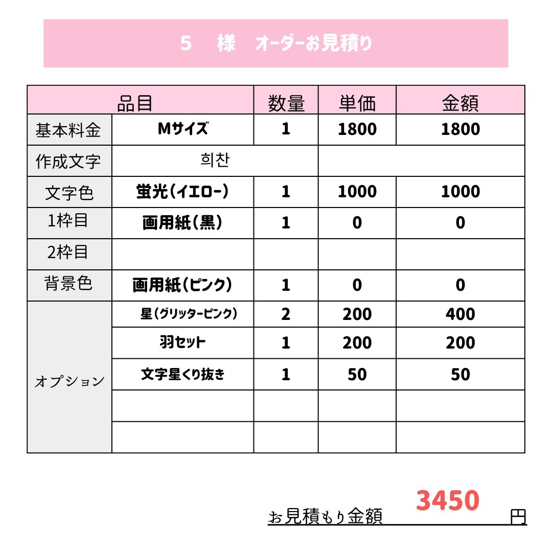 ※こちらは 5 様専用ページです。 ご本人様以外の購入はお控えください。 ✧*̣̩☽⋆゜✧*̣̩☽⋆゜✧*̣̩☽⋆゜✧*̣̩☽⋆゜✧*̣̩☽⋆゜✧*̣̩☽ 5 様 この度はオーダーいただきありがとうございます。 サンプル画像御覧ください。 サンプル作成後変更は2回まで無料です。 変更等ございましたら【質問する】よりお気軽にご相談ください。 【オーダー内容】 明細を御覧ください。 ---------------------------------------- 見積金額 3450円 サンプル確認いただけましたら、価格変更後→ご購入→発送となります。 作成後のキャンセルはできかねます。ご了承ください。 ご質問等ございましたら【質問する】よりお願いいたします。
