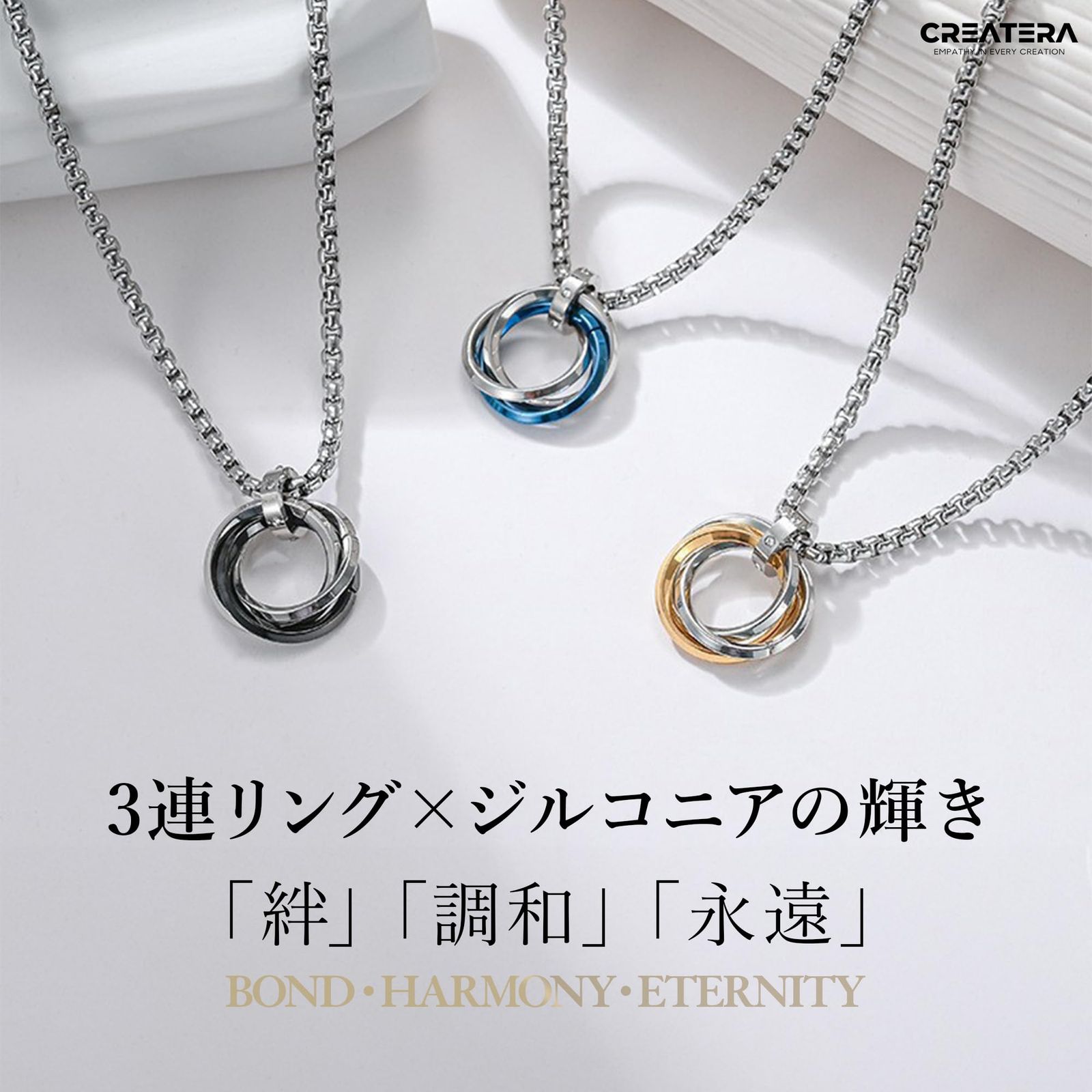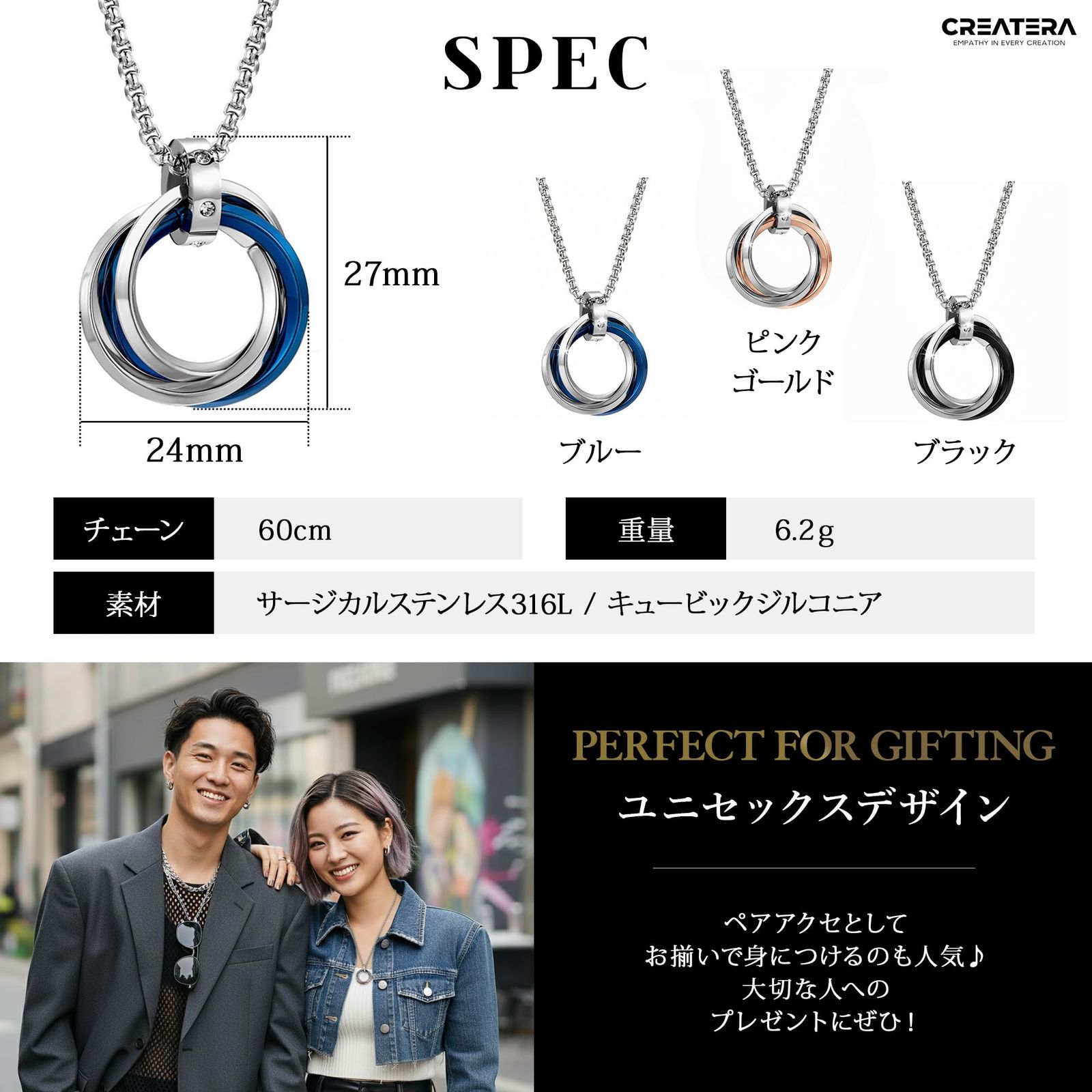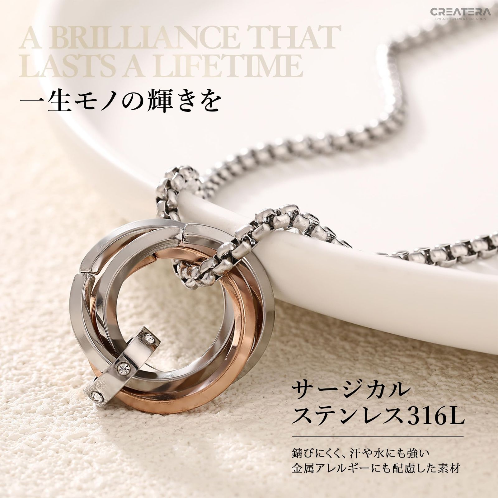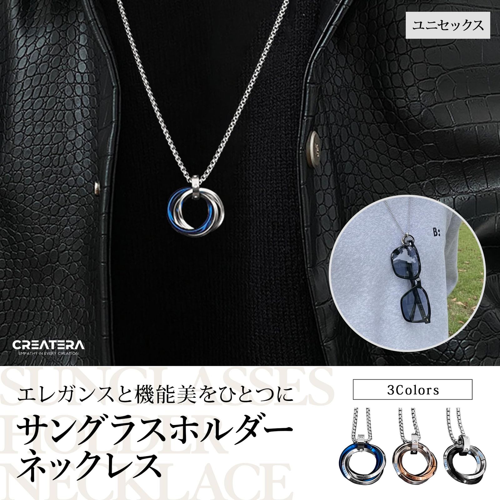 【エレガントに輝く「3連リング × ジルコニア」デザイン】 3つのリングが重なり合うトリプルデザインは、「絆」「調和」「永遠」を象徴。中央のジョイント部分にはキュービックジルコニアをあしらい、動くたびに上品な輝きを放ちます。 そのさりげない煌めきが胸元を印象的に演出し、カジュアルにもフォーマルにも自然に馴染む万能アクセサリーです。ブラック・ブルー・ピンクゴールドの3色展開で、シンプルながらも上質感が漂い、男女問わず身につけられるユニセックスデザイン。ファッションを選ばず、日常のワンシーンに洗練されたアクセントを添えます。【サングラスホルダーとしての実用性とスマートさ】 美しいだけでなく、機能性にも優れています。中央のリング部分にサングラスやメガネのツルを通すことで、スマートに首から下げられる2WAY仕様。 外出時に「サングラスの置き場がない」「メガネケースを持ち歩くのが面倒」といった悩みを解決。街歩き、ドライブ、アウトドア、旅行などあらゆるシーンで活躍します。ファッションと利便性を兼ね備えた、まさに“使えるアクセサリー”です。【サージカルステンレス316L – 一生モノの輝きを】 リングはチタンメッキ、チェーンには医療用にも採用される高品質素材「サージカルステンレス316L」を使用。錆びにくく、汗や水にも強いため、日常使いはもちろん、雨の日や入浴時でも安心して着用できます。 酸化や変色に強く、メンテナンスも簡単。さらに金属アレルギーにも配慮した素材のため、敏感肌の方にもおすすめです(※個人差あり)。 「一生モノの輝き」を日常に——そんなコンセプトを体現した素材です。【軽量・快適で上質な着け心地】 全長約60cmのチェーンは、首元に自然に馴染むバランス設計。適度な重量感がありながらも軽やかで、長時間つけてもストレスを感じにくい仕様です。 チェーンは滑らかに光を反射し、肌当たりも柔らか。Tシャツにもシャツスタイルにも合わせやすく、オンオフ問わず幅広いコーディネートに対応します。【贈る人のセンスが光るギフトアイテム】 高級感あるデザインと実用性を兼ね備えたこのネックレスは、誕生日や記念日、クリスマス、バレンタインなどのプレゼントにも最適。男女どちらにも似合うユニセックスデザインのため、ペアアクセとしても人気です。お揃いで身につけることで、離れていても「絆を感じる」アクセサリーとして人気です。ファッションを選ばず使えるため、贈られた相手もすぐに活用できるのが嬉しいポイント。大切な人へのギフトにふさわしい逸品です。 胸元で輝く3連リングとキュービックジルコニアの煌めき——。 CREATERA サングラスホルダーネックレスは、デザイン性と機能性を融合したユニセックスアクセサリーです。 医療用サージカルステンレス316Lを使用し、汗・水・サビに強く、金属アレルギーにも配慮。リング部分にはサングラスやメガネを掛けられるホルダー機能を備え、日常の“困った”をスマートに解決します。 シンプルながら存在感のあるデザインは、カジュアルにもフォーマルにもマッチ。ブラック・ブルー・ピンクゴールドの3色展開で、恋人や友人とペアで楽しめます。 「使うほどに、自分らしさを纏う」——あなたの毎日に、上質な輝きを。
