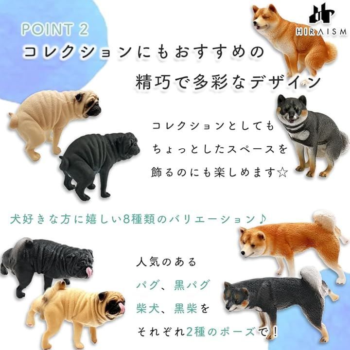 「本物そっくりのリアルな動物モデル」リアルポーズのドッグフィギュアは、柴犬とパグを細部まで忠実に再現した本物そっくりのデザインが特徴です。