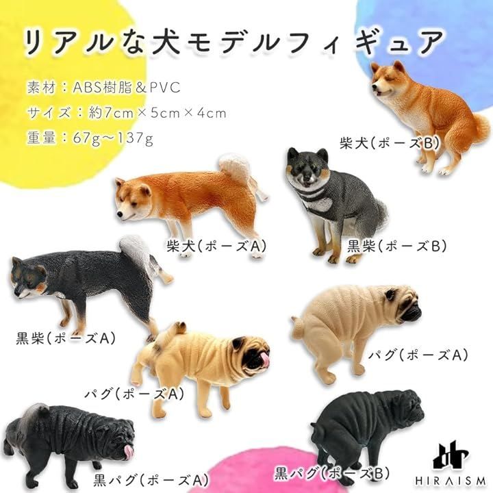 「商品詳細」リアルな犬モデルフィギュアセット(柴犬、黒シバ、パグ、黒パグ) サイズ:約7cmx5cmx4cm 重量:67g~137g 素材:ABS樹脂&PVC