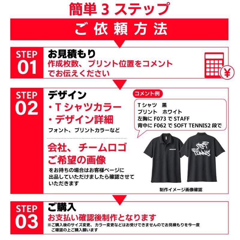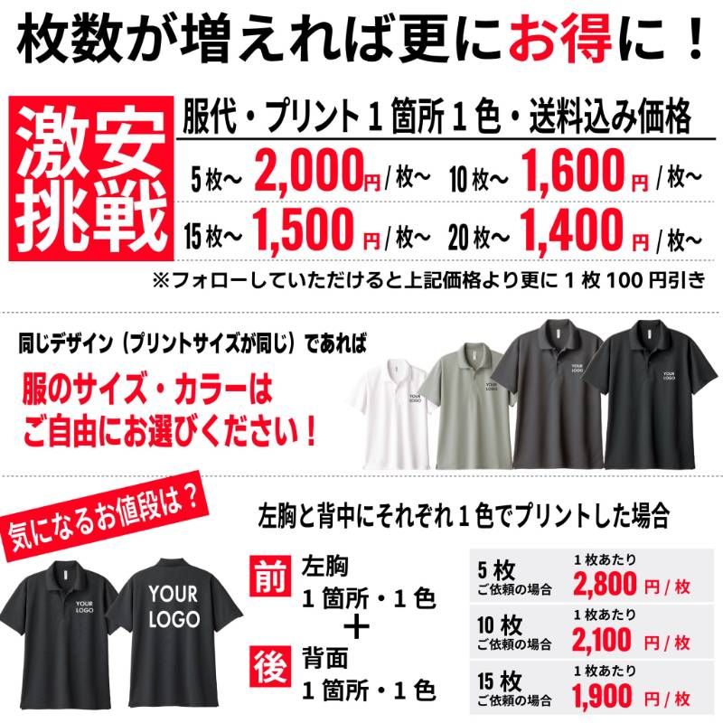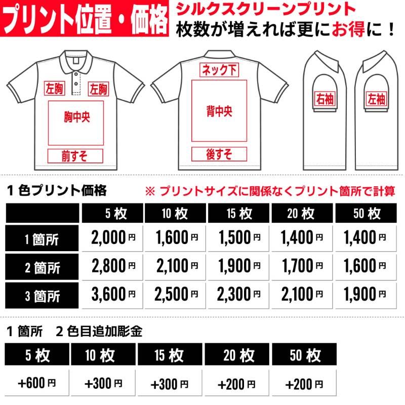 オリジナルポロシャツの作成はIGNITE-STYLEにお任せください。 カフェ、居酒屋、スタッフT、ユニフォームなど幅広くご利用いただいております。 オリジナルポロシャツをスタッフ、チーム、クラブ、クラスT、ユニフォームなどで揃えてみませんか? ■プリント方法 シルクスクリーン印刷、フルカラープリント、ラバー転写プリント、昇華転写プリントよりお客様のご要望に合わせてご提案させていただいております。 アパレルブランドで使用されるプリント方法で作成いたしますのでご安心ください。 ■お見積もり、デザイン確認は無料 ご納得いただいてからご購入頂きますのでまずはお気軽にお問合せください! ■ご注文方法■ ①下記3点を教えてください  □ご依頼枚数・サイズ・カラー  □印刷箇所  □デザイン内容(画像がある場合は専用で出品をお願いします) ②イメージサンプル作成 ③ご購入後作成→発送 ※ 追加プリントは画像参照願います。 ※ ポロシャツカラー、サイズはバラバラでもOKです。 ※表示価格700円は20枚以上無地でのご注文の場合の価格となります。 ??????????????????? ■納期  ご購入後、土日祝日を除く7?21日以内に発送いたします。 ※混み具合によっては前後いたします。 ■注意事項  ご購入後のサイズ変更、カラー変更、デザイン変更はできませんので最終確認は必ずお願い致します。  ご購入後のキャンセルはできませんのでご了承願います。 ■取り扱い商品 Tシャツ、ドライTシャツ、ロングTシャツ、パーカー、スウェット、ブルゾン、キャップ、トートバッグ ステッカー、ミニノボリ、キーホルダー、ハンカチ