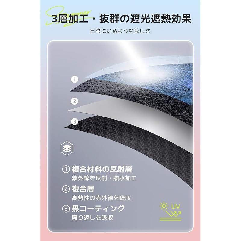 【99.9%以上UVカット・遮熱遮光】強い日差しを気にせずお出かけできるように、多層構造を採用し、UVを99.9%以上カット、遮光率99.9%以上、効果的に日焼け止めすることができます。UPF50+のレベルにより、紫外線による肌へのダメージを完全に防ぐことができます。裏にはブラックコーティング加工を施している生地を採用しているので、地面や壁面からの照り返しによるUV反射もカットし、お肌と目を保護します。厳しい暑さから身体を守る高い遮熱性も実現しています。