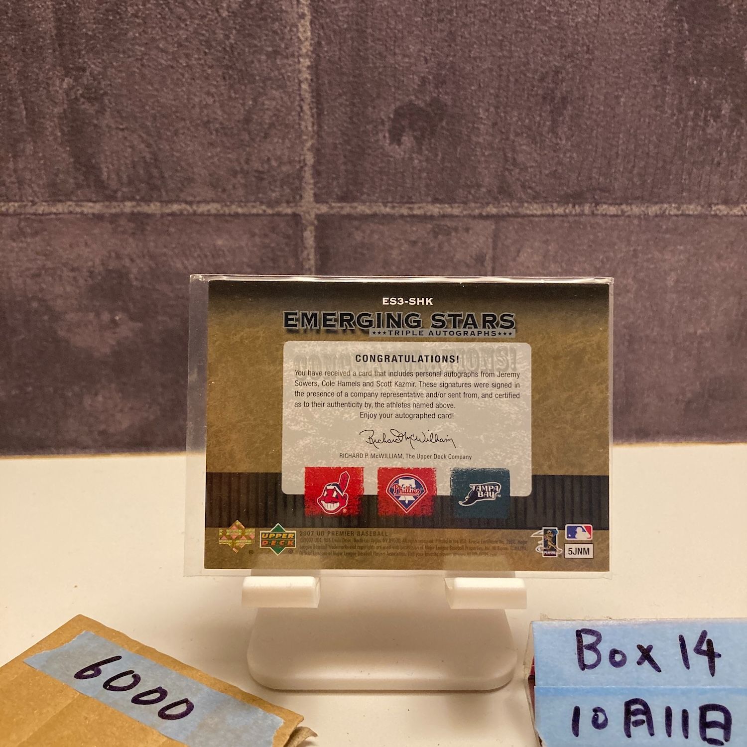 2007-08 Upper Deck Premier Jeremy Sowers Cole Hamels Scott Kazmir 18/50 直筆サインカード Cleveland Indians Emerging Stars カード