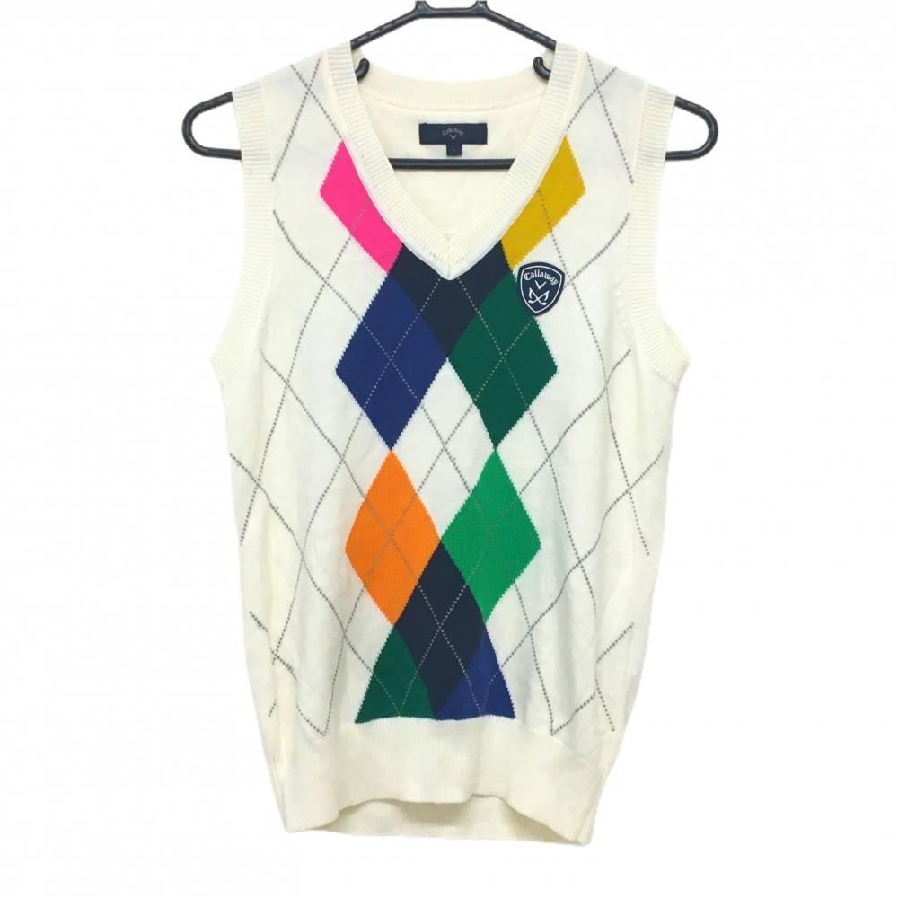 【美品】キャロウェイ ニットベスト 白×マルチカラー 一部アーガイル柄 ロゴワッペン レディース L ゴルフウェア Callaway