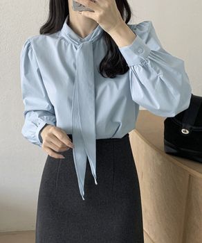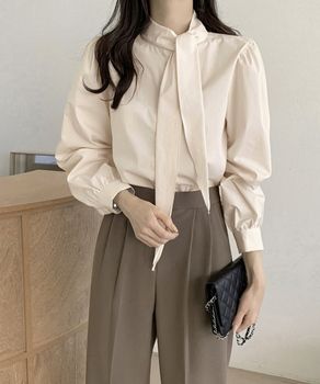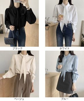 レディース オフィスカジュアルリボントップス 体型カバー立ち襟ブラウス 着やせ 大人女性 おしゃれシャツ 30代40代長袖 ブラウス春秋 ゆったりシャツ無地 大人上品ブラウス黒