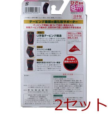 ・U字型のテーピング編みが、ひざのお皿を持ち上げるようにサポートし、左右のブレを抑えひざを伸ばす力を助けます。