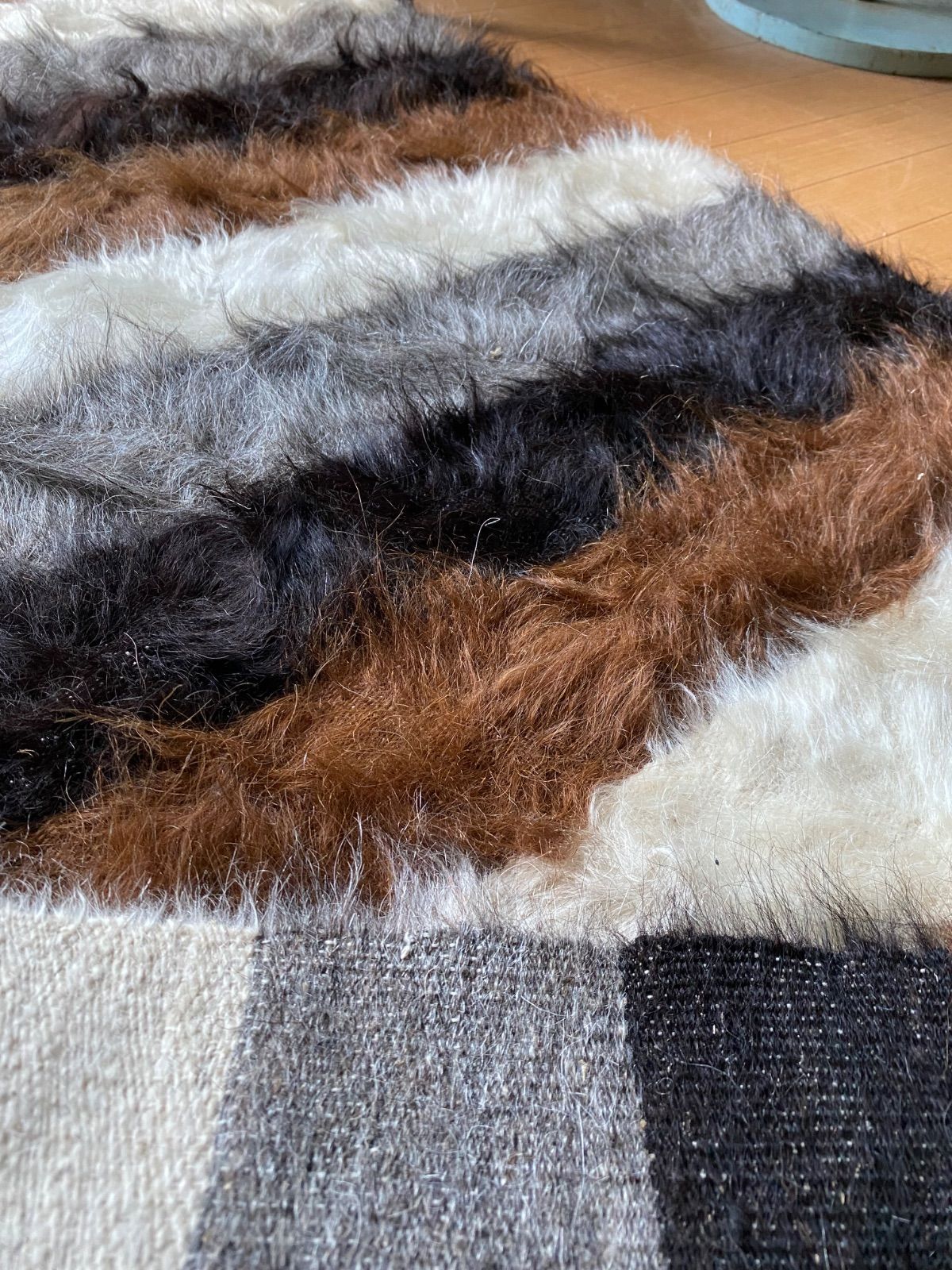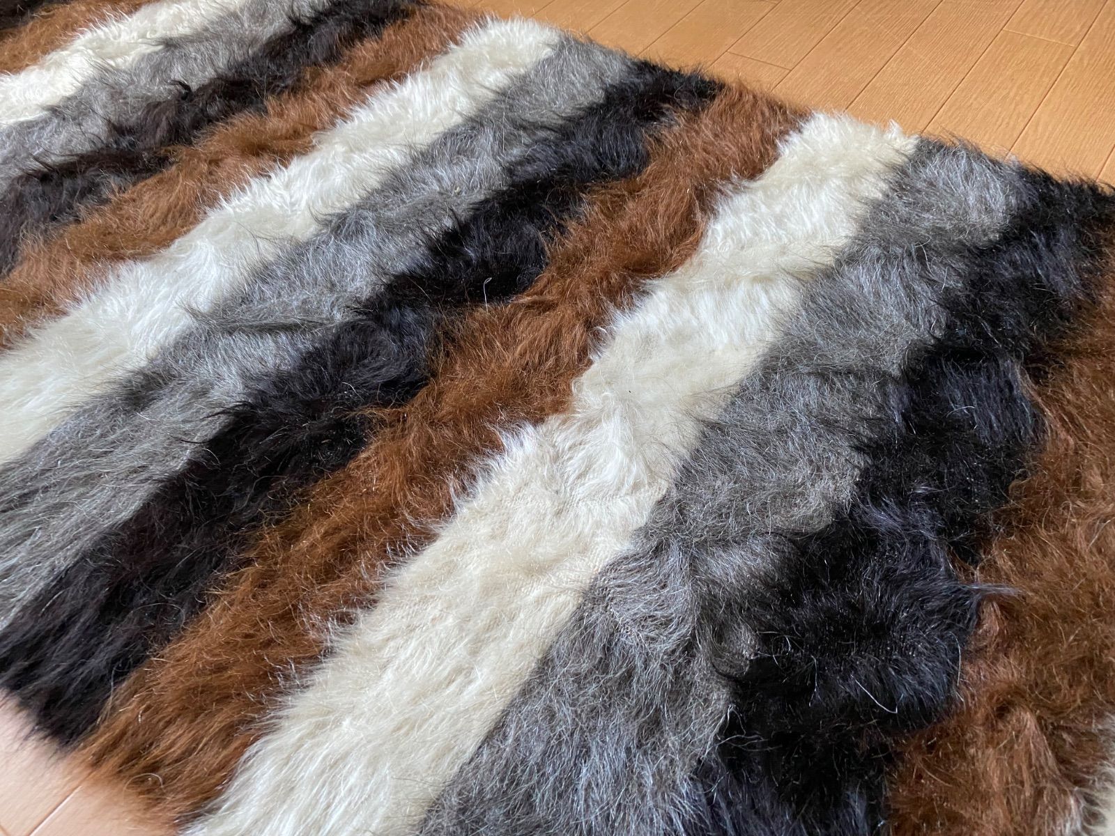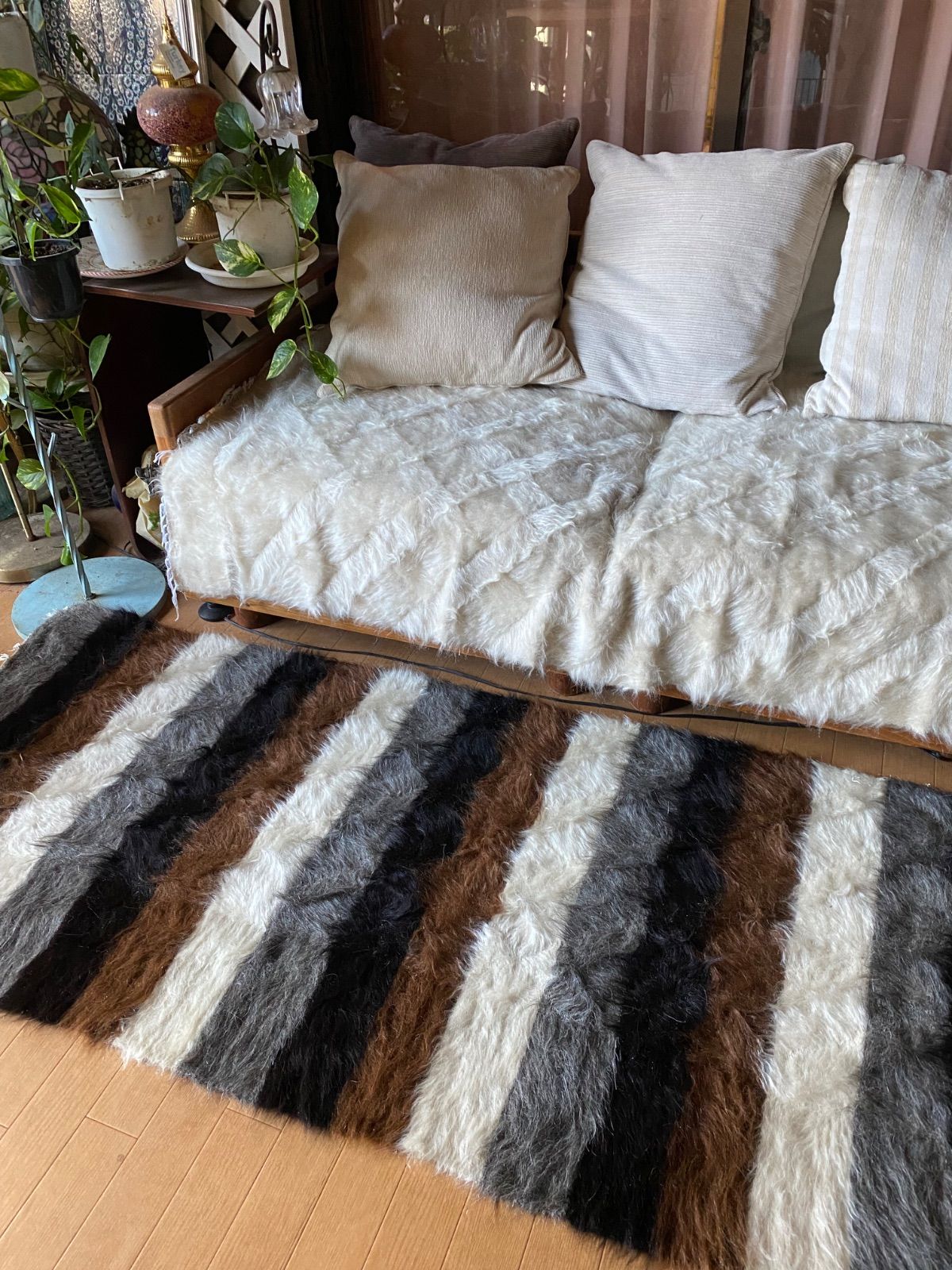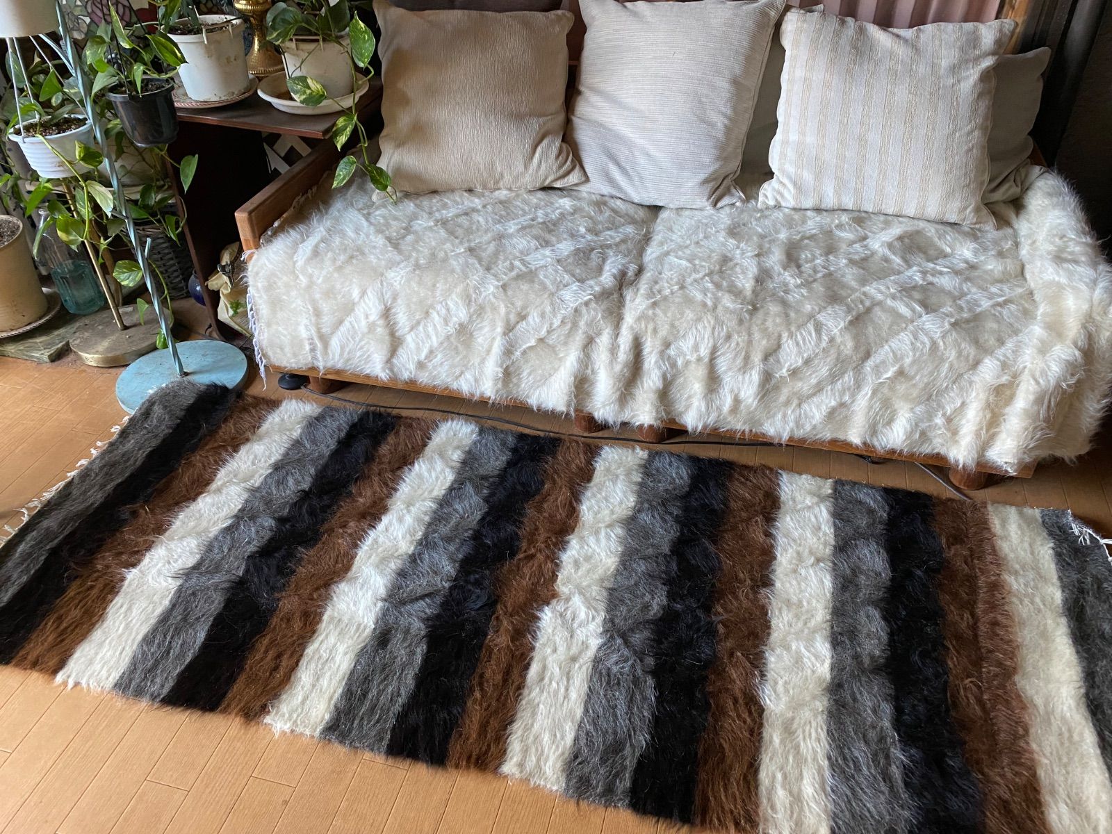 今の新しいものにくらべ、アンティークのバッタ二エと同じくらい密度が濃く、毛の艶がさらに良い山羊の毛で織られています。 未使用ですが、 ご覧いただけますように毛足も長めでつやつやです。30〜40年ほど前に織られていますが、ほぼ未使用のヴィンテージ未使用品になります。