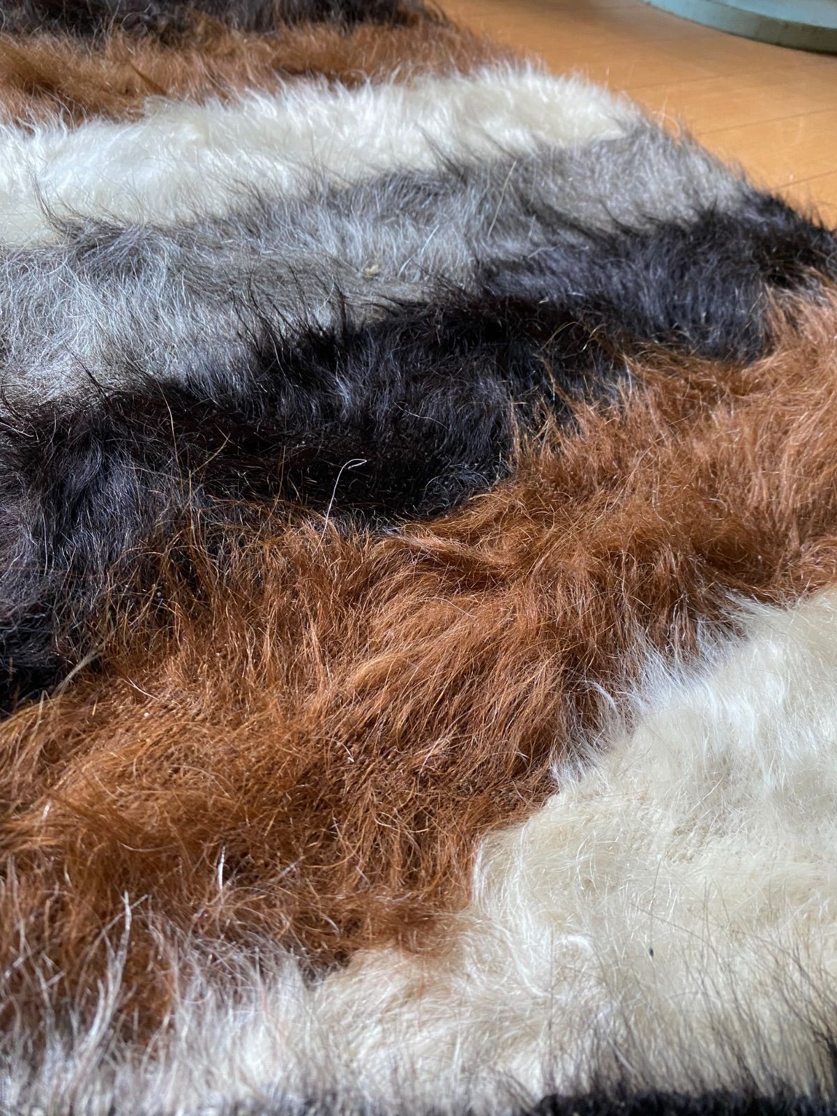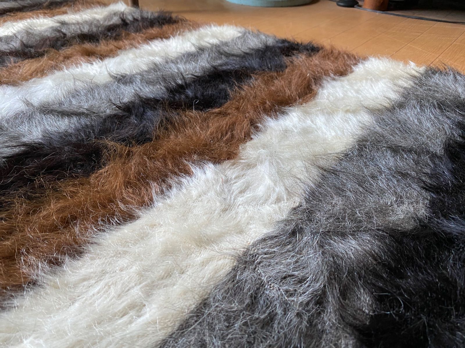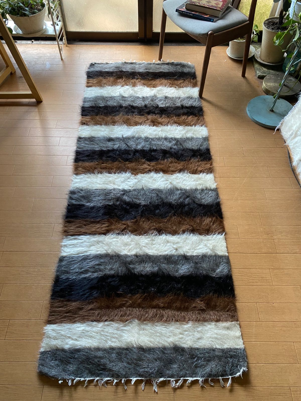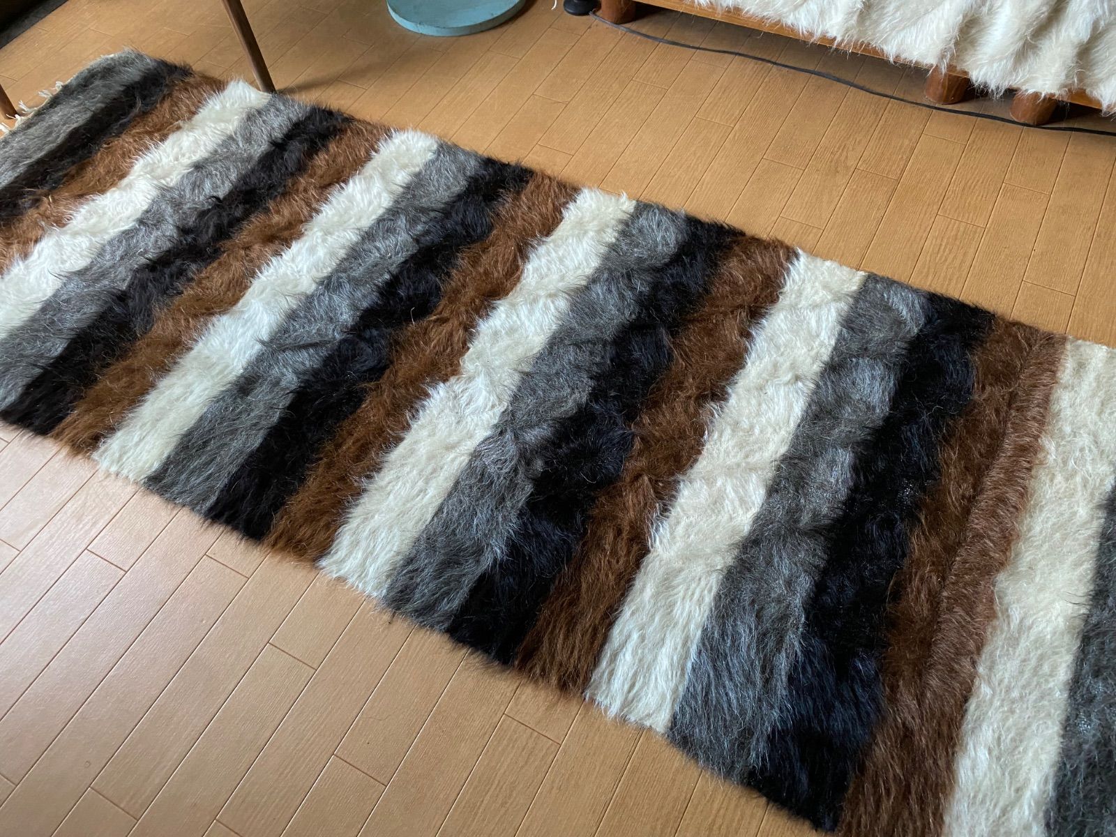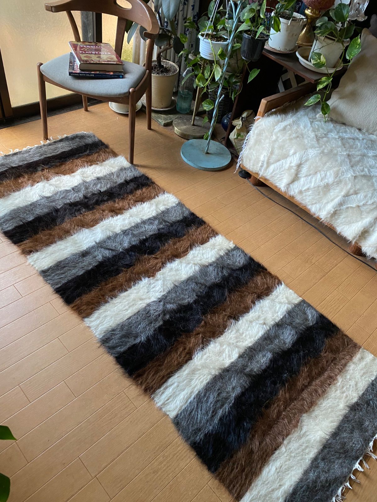 今の新しいものにくらべ、アンティークのバッタ二エと同じくらい密度が濃く、毛の艶がさらに良い山羊の毛で織られています。 未使用ですが、 ご覧いただけますように毛足も長めでつやつやです。30〜40年ほど前に織られていますが、ほぼ未使用のヴィンテージ未使用品になります。