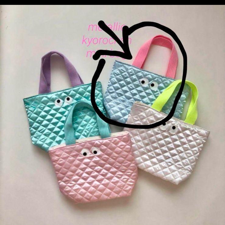 このたびもありがとうございます=(^.^)= 引き続きよろしくお願い致します。 //キョロちゃんとメタリックミニトート ブルー 持ち手→ネオンピンク 2300円 ◯わんこ用まんまるスタイ むぎゅっとこいめ 幅5㎝ 750円 オーダー料金300円 リピート30円 ⚫︎合計3570円