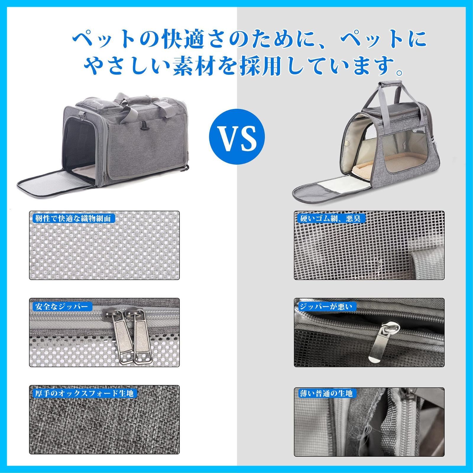 【材質改良】 ペットの安全のために、耐久性のある金属素材を使用しています。ショルダーストラップのフック、ストラップの長さを調整するバックル、飛び出し防止ベルトのフックは、壊れやすいプラスチックのフックではなく、耐久性のある金具を採用しています。壊れやすいジッパーではなく、安全なジッパーを使っています。ペットの快適さのために、ペットにやさしい素材を採用しています。硬い悪臭のゴム網ではなく、靭性で快適な織物網面を使っています。薄い普通の生地ではなく、厚手のオックスフォード生地を使っています。