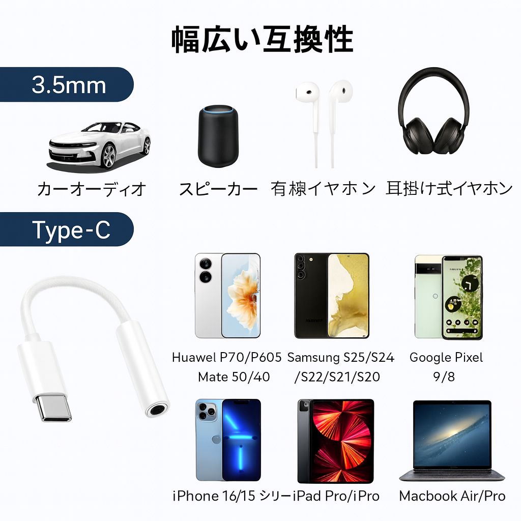 タイプC イヤホン 変換アダプタ USB Type-C イヤホンジャック 3.5mm 【アイフォン15 16対応】 イヤホンコネクター ヘッドホン タイプc イヤホン 変換 イヤホンジャック 3.5mm usb イヤホン変換アダプター 音量調節/通話/音楽対応 DAC搭載 ハイレゾ音質 iPhone15 シリーズ/Pad/Mac/Android などに適用 互換品