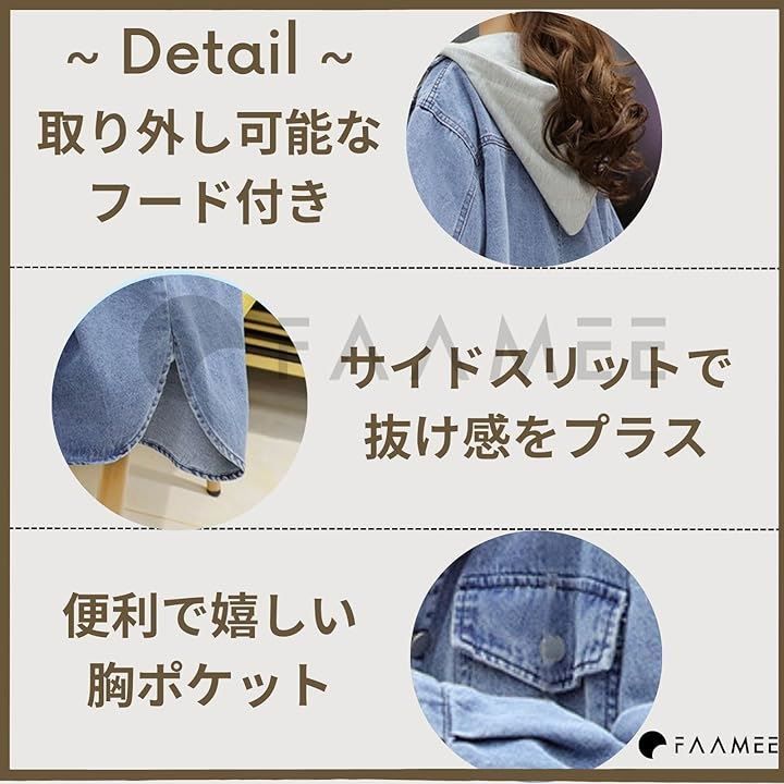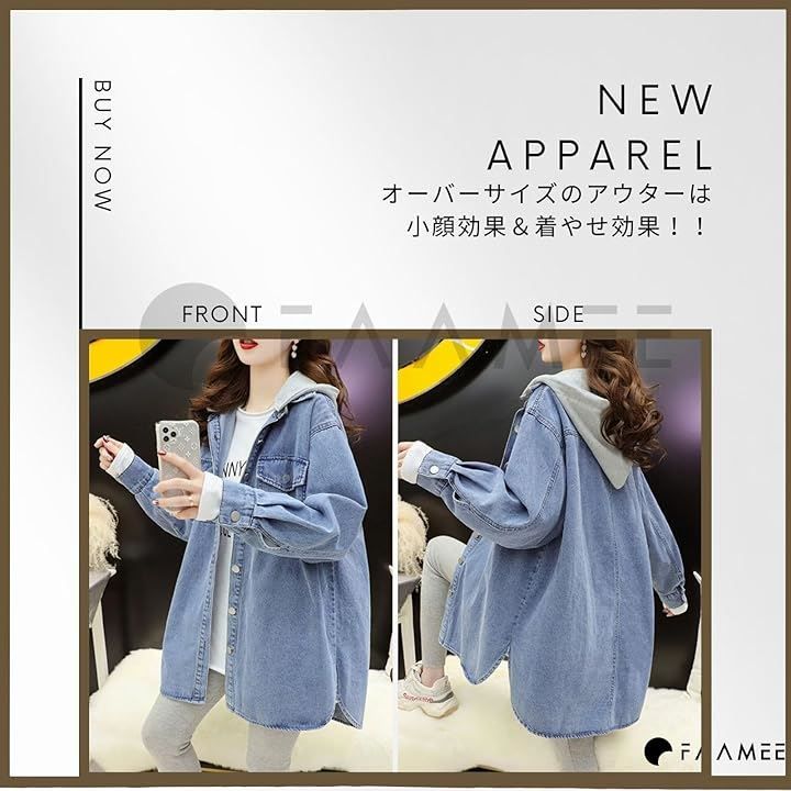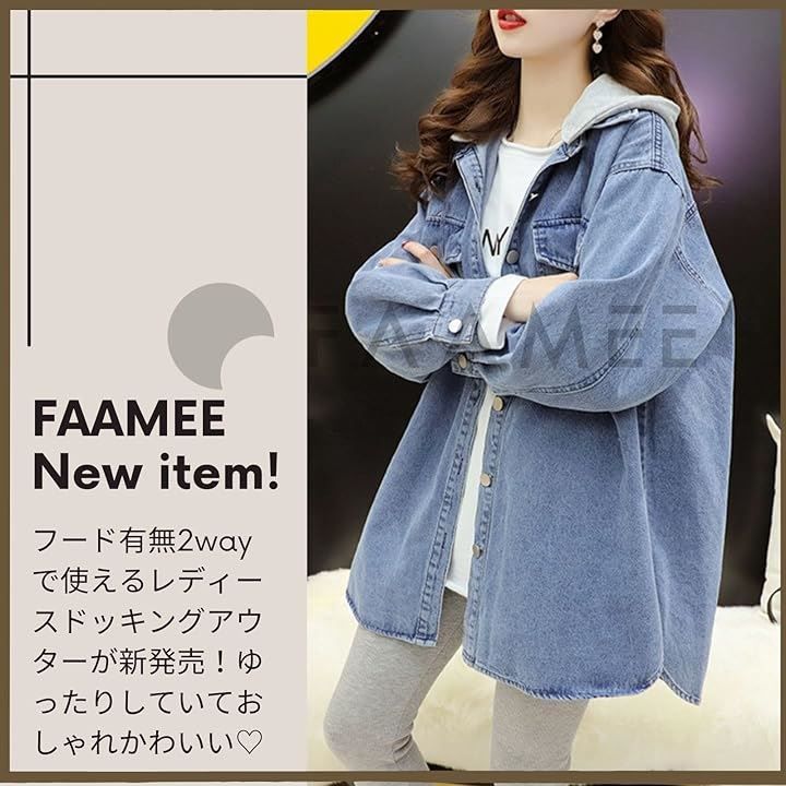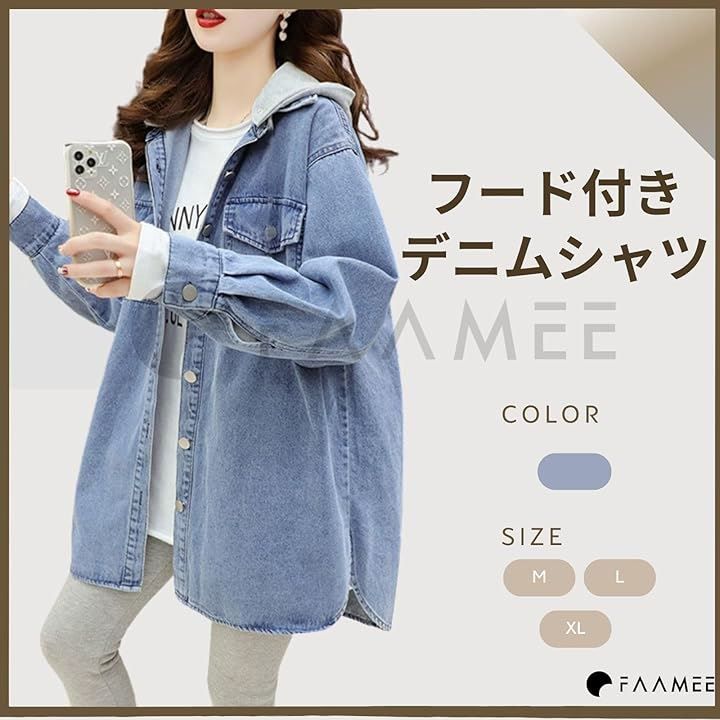 FAAMEE(フェイミー) デニムシャツ フード付き おしゃれ アウター 長袖 レディース ドッキング ゆったり 大きいサイズ オーバーサイズ 秋(インディゴブルー, L)