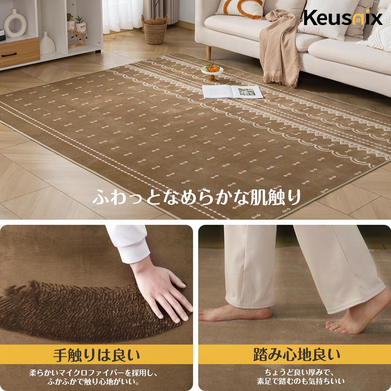 Keusnix ラグ カーペット ラグマット滑り止め付 洗える 200×250cm 約3畳 絨毯 防ダニ 抗菌 防臭 オールシーズン快適に使用 床暖房 ホットカーペット対応 ふわふわ肌触り フランネルラグ モダンエスニック柄・ココア 色: モダンエスニック_サイズ: 200 x 250 cm (長方形) 【フランネルラグ-優れた肌触り】極細繊維で作られたフランネル素材のラグマットはソフトでしなやか、滑らかな感触を実現します。肌ざわり良いし、短毛タイプのラグマットなので、ネコや犬の毛が付いても、掃除機で簡単に取れます。 【安全安心-滑り止め付ラグ】防ダニ・抗菌・防臭、 ノンスリップ加工。カーペットの裏面にはゴム製の滑り止め付き、フローリングに敷いても滑りにくく、お子さまやお年寄りのいるご家庭でも安心使用できます。ワンちゃんがラグマットに飛び乗ってもずれません。 【オールシーズンカーペット】フランネル生地は速乾性、吸水性、通気性が優れ、夏はさらりと、冬は暖かく、季節が考えなくて年中使えるカーペットです。色落ちせず、抜け毛もない、夏は冷房対策、冬はホットカーペット・床暖房対応。リビングマットとしても快適に使用できます。 掃除機 ・ 洗濯機対応-洗えるラグ】このラグは洗濯機で丸洗いOK(洗濯機洗いする場合は洗濯用中性洗剤をご使用の上、ドラム式洗濯機で洗える時に洗濯ネットに入れて裏側を内側にして洗ってください)。絨毯の毛が短い、ゴミやほこりが絡まりにくい、掃除機もかけやすい。うっかり飲み物をこぼしても、すぐに拭き取れば大丈夫です。軽量設計、折り畳み可能、女性の方でも簡単に持ち運びができます。 【ラグ仕様】ラグサイズ 3畳 200×250cm 。起毛の高さ:約4mm、ウレタン厚:約5mm、不織布と滑り止め加工は約1mm、合計厚さ約10mmです。 絨毯表地:ポリエステル100% 中材:ウレタンフォーム 裏地:ポリエステル100%(不織布) ブランド Keusnix サイズ 200 x 250 cm (長方形) 商品の重量 2 キログラム パイル高さ ショートパイル 構造タイプ マシンメイド