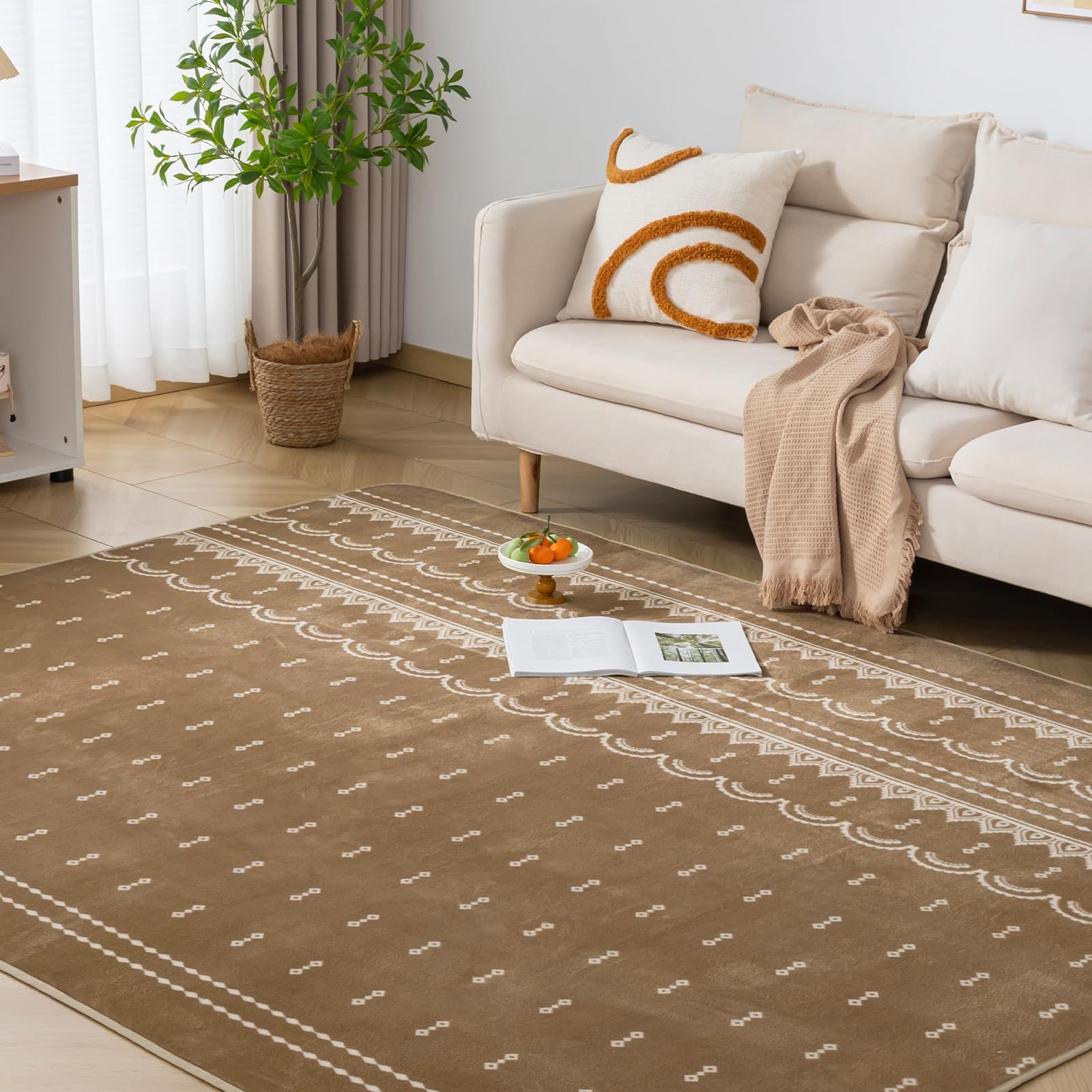 Keusnix ラグ カーペット ラグマット滑り止め付 洗える 200×250cm 約3畳 絨毯 防ダニ 抗菌 防臭 オールシーズン快適に使用 床暖房 ホットカーペット対応 ふわふわ肌触り フランネルラグ モダンエスニック柄・ココア