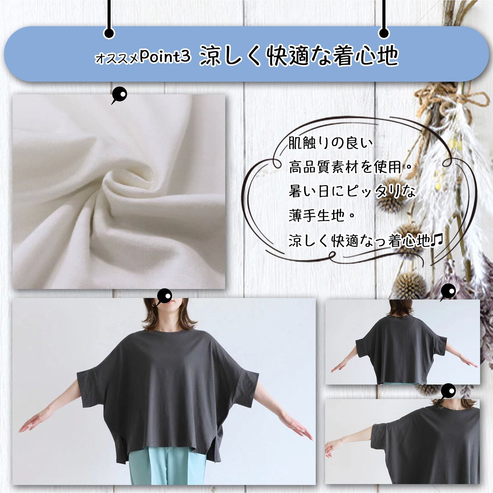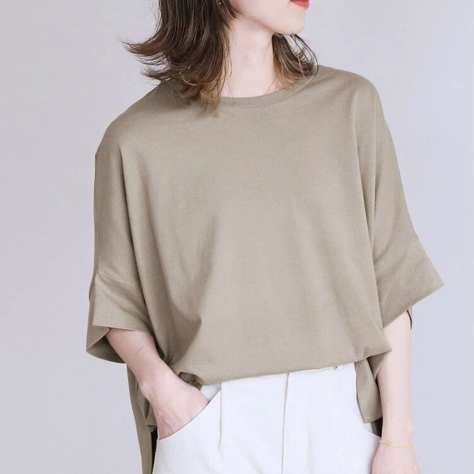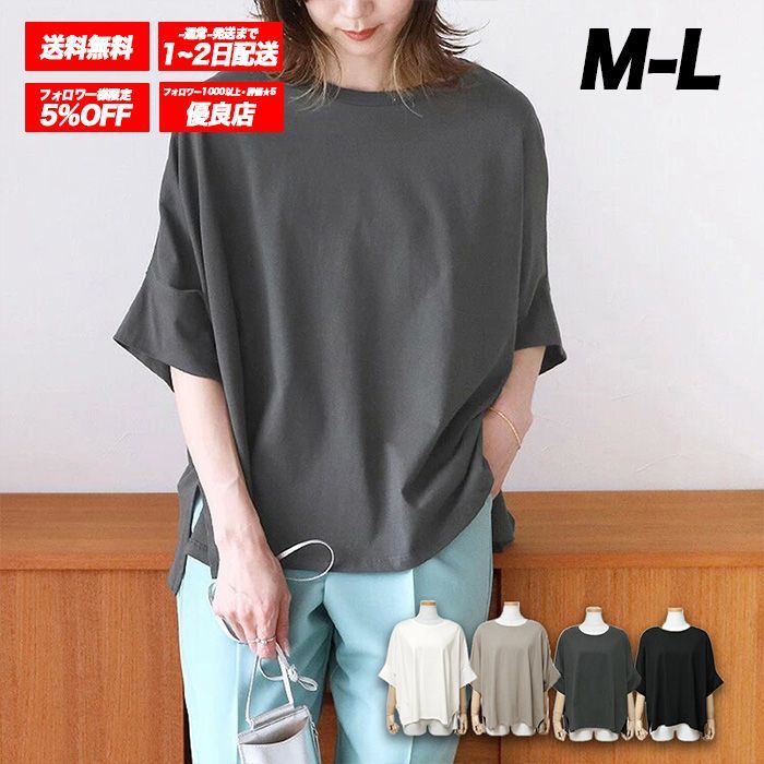 💛フォローで5%OFFキャンペーン実施中 🚚全国送料無料🎁在庫わずか📦追跡番号で安心⏰迅速発送✨新品アイテム ●サイズ: M: 着丈/55前cm、着丈/後60cm、袖丈(襟-袖)44cm L: 着丈/前57cm、着丈/後62cm、袖丈(襟-袖)46cm ●カラー: ベージュ/ブラック/ダークグレー/ホワイト ☆dark grey☆ ※こちらに無いカラーは別ページにて展開致しておりますので、そちらもご覧ください。 裏地: なし 透け感: 淡い色若干 伸縮性: あり 生地の厚さ: 普通 ●備考: ※入荷時期により若干のデザインが変わる可能性がございます。       ※輸入品の為、輸送時に生じるキズ・汚れ・箱潰れがある場合がございます。 ※生地の特性上、やや匂いが強く感じられるものもございます。    数日のご使用や陰干しなどで気になる匂いはほとんど感じられなくなります。 ※製品によっては、生地の特性上、縮む場合がございますので洗濯時はご注意下さいませ。 ※生地によっては摩擦(特に湿った状態)や、汗や雨などで濡れたときは他の衣類や下着に移染する場合がございます。  また淡色物に色移りする場合がございますので、お洗濯後はすみやかに(脱水、乾燥等)するようにお願いいたします。 ※お客様が使用するパソコンのモニター設定や部屋の照明により多少、画像と実際の商品に若干の違いが生じる場合がございます。 ※機械による生産の為、生地の継ぎ目の若干のズレやほつれなど、形やサイズに多少の誤差が生じる場合がございます。  また、混紡繊維によって生地の織りに他繊維が混紡している場合もございますが品質上の問題はございません。       ※生地の取り位置によりどうしても絵柄の出方・ニュアンスなど多少の個体差が生じ、  画像と表情が異なることがございます。また柄が縫い合わせ部分で必ずしも合っていないことがございます。 ※サイズ詳細等の測り方はスタッフ間で統一、徹底はしておりますが、実寸は商品によって若干の誤差(1cm〜3cm )がある場合がございますので、予めご了承ください。 ※同じ商品でも“生産時期”や“カラー“により形やサイズに多少の“誤差“が生じる場合もございます。 詳しくは商品画像や実寸サイズにてご確認くださいませ。 ※プリント生地の商品については、生地の裁断・縫製方法により写真と同様の柄が出ない場合がございます。 ※実際の色に近づけるため、タグのカラー名称と異なる場合がございます。 その他気になる点が御座いましたらお気軽にお問い合わせくださいませ。 #Tシャツ #レディース #tシャツ #トップス #カットソー #5分袖 #半袖 #ドルマン #スリット #無地 #ベーシック #お洒落 #綺麗め #可愛い #ゆったり #春 #夏 #秋 #送料無料 #数量限定 #安心安全 #追跡可能配送 #sun #sunshop #メルカリshops