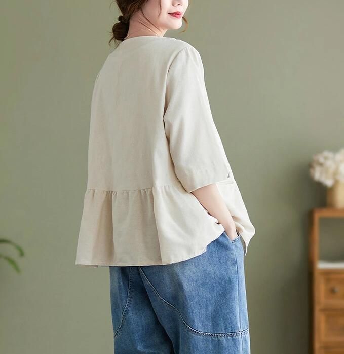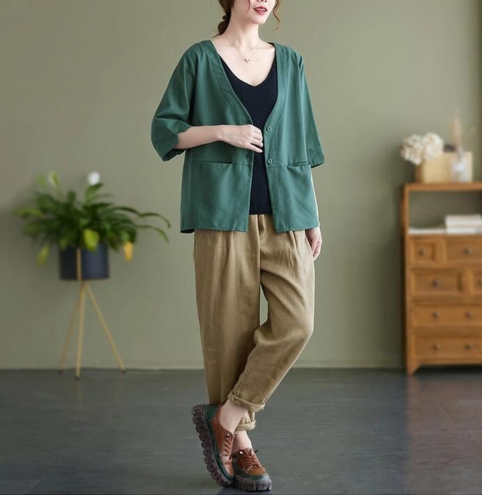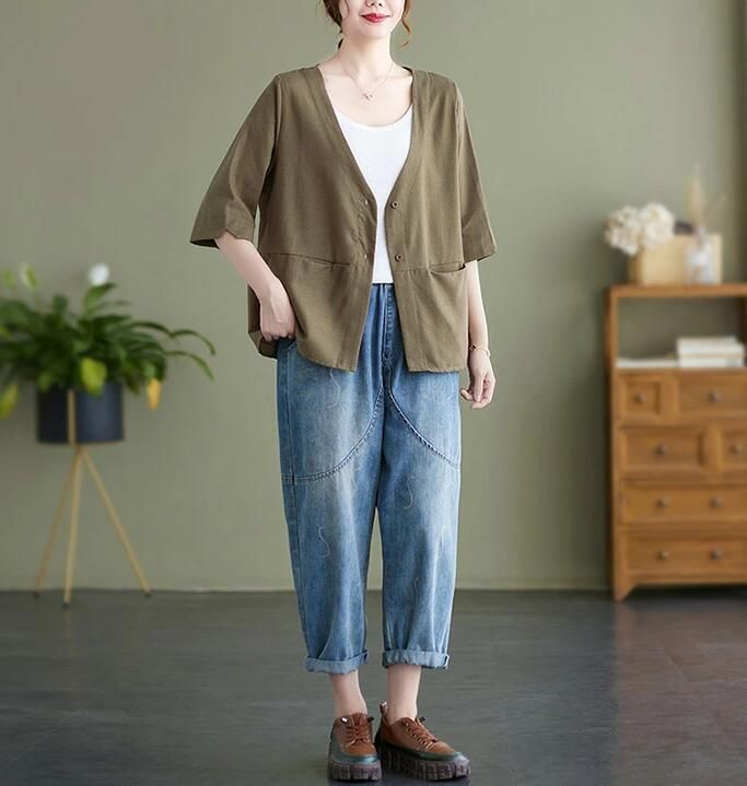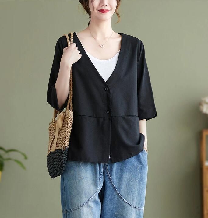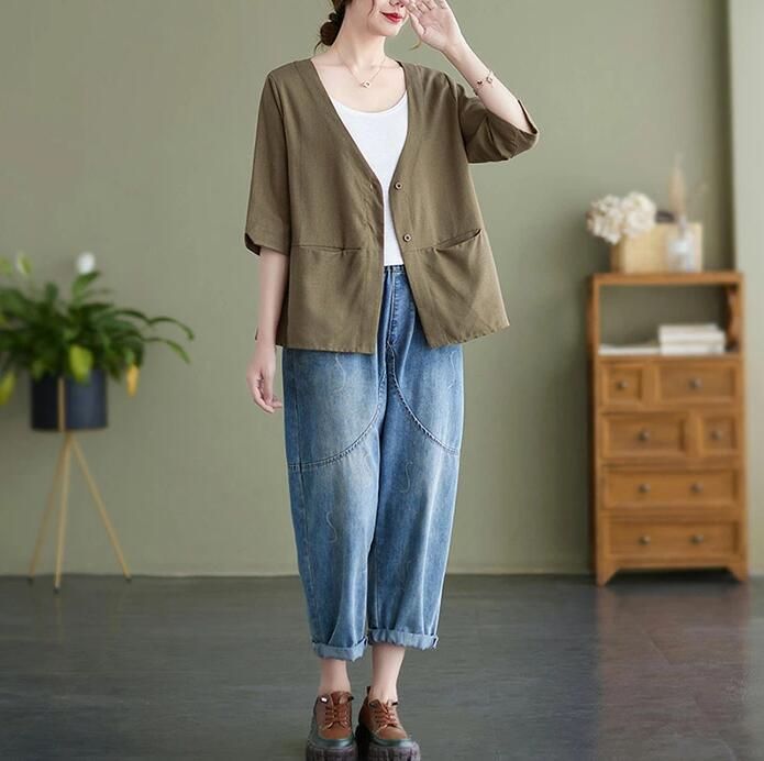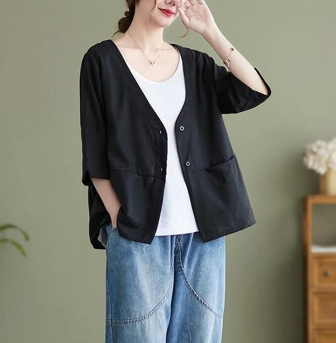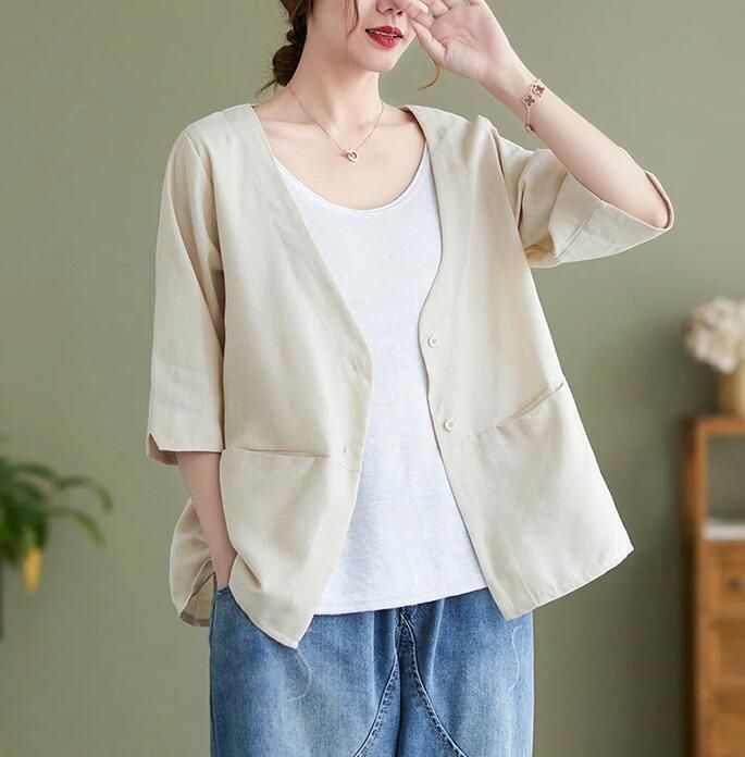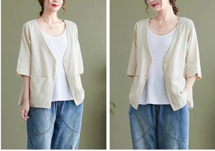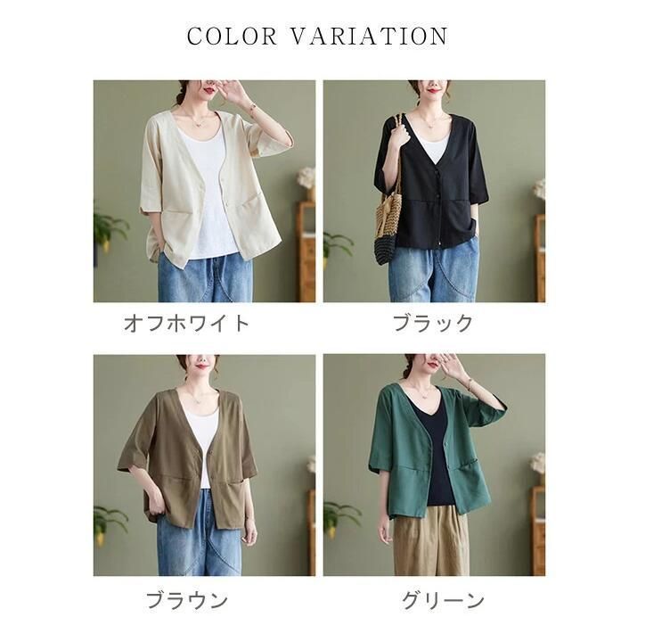 ジャケットノーカラーレディースゆったり半袖ジャケットテーラードジャケットトップス大きいサイズ綿麻風体型カバーカ半袖春夏