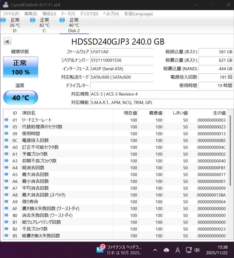 ご覧いただきありがとうございます。 PCパーツの整理のため、まとめて出品いたします。 ​SSDは使用時間が非常に短いですが、詳細なテストまでは行っていないため、全て「ジャンク品(保証なし)」として出品します。 ​【セット内容】 ① SSD 240GB (2.5インチ SATA) メーカー: HIDISC 型番: HDSSD240GJP3 状態: PCで認識確認済み。CrystalDiskInfoにて「正常 100%」、使用時間19時間と表示されています。(画像参照) ​② ノートPC用メモリ 4GB × 3枚 合計: 12GB メーカー: Samsung / Elpida など 規格: PC3-12800S / PC3-10600S など ※規格や電圧(通常版・低電圧版)が混在しています。相性等は保証できませんので、画像にてチップ型番等をご確認ください。 ​【商品状態と注意事項】 ​BIOSでの認識やCrystalDiskInfoの読み取りなど、簡易的な確認のみ行っています。 ​メモリテストやOSインストールなどの長時間負荷テストは行っていません。 ​**「ジャンク品」**ですので、動作保証はありません。お手持ちの機種との相性問題や、万が一動作しなかった場合でも返品・返金対応は致しかねます。 ​部品取りや研究用、ご自身で対処できる方のみご購入ください。 ​【発送について】 静電気防止等の対策を行い、緩衝材で包んで「らくらくメルカリ便(またはゆうゆうメルカリ便)」にて発送予定です。 ​即購入OKです。 バラ売りは考えておりません。 よろしくお願いいたします。 ​※他サイトでも同時に出品しております。 そちらで先に売れてしまった場合は、予告なく出品を取り消すか、タイミングによっては購入をキャンセルさせていただく場合がございます。あらかじめご了承ください。