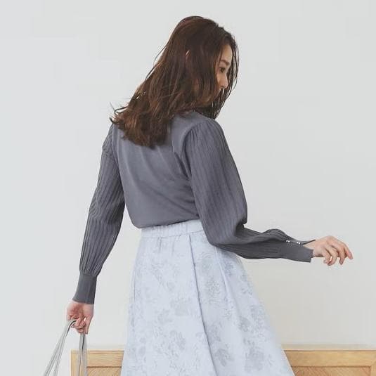 ・プリーツスリーブに小粒パール調の付属とスリットがポイントのボートネックニットです。