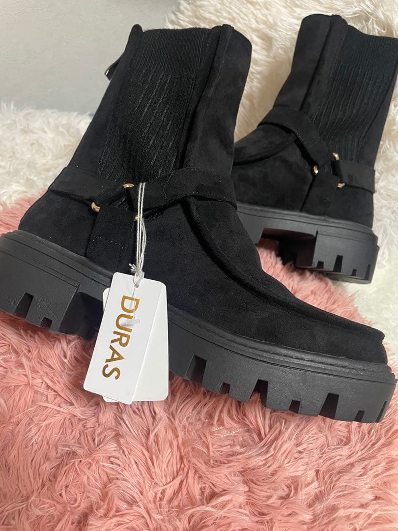 新品スエード素材のブラックショートブーツ、厚底ソールでスタイリッシュなデザイン。Mサイズ定価7500円 - ブランド: DURAS - 色: ブラック - 素材: スエード - ソールのデザイン: 厚底ソール - スタイル: ショートブーツ - 特徴: サイドゴアデザイン ご覧いただきありがとうございます。