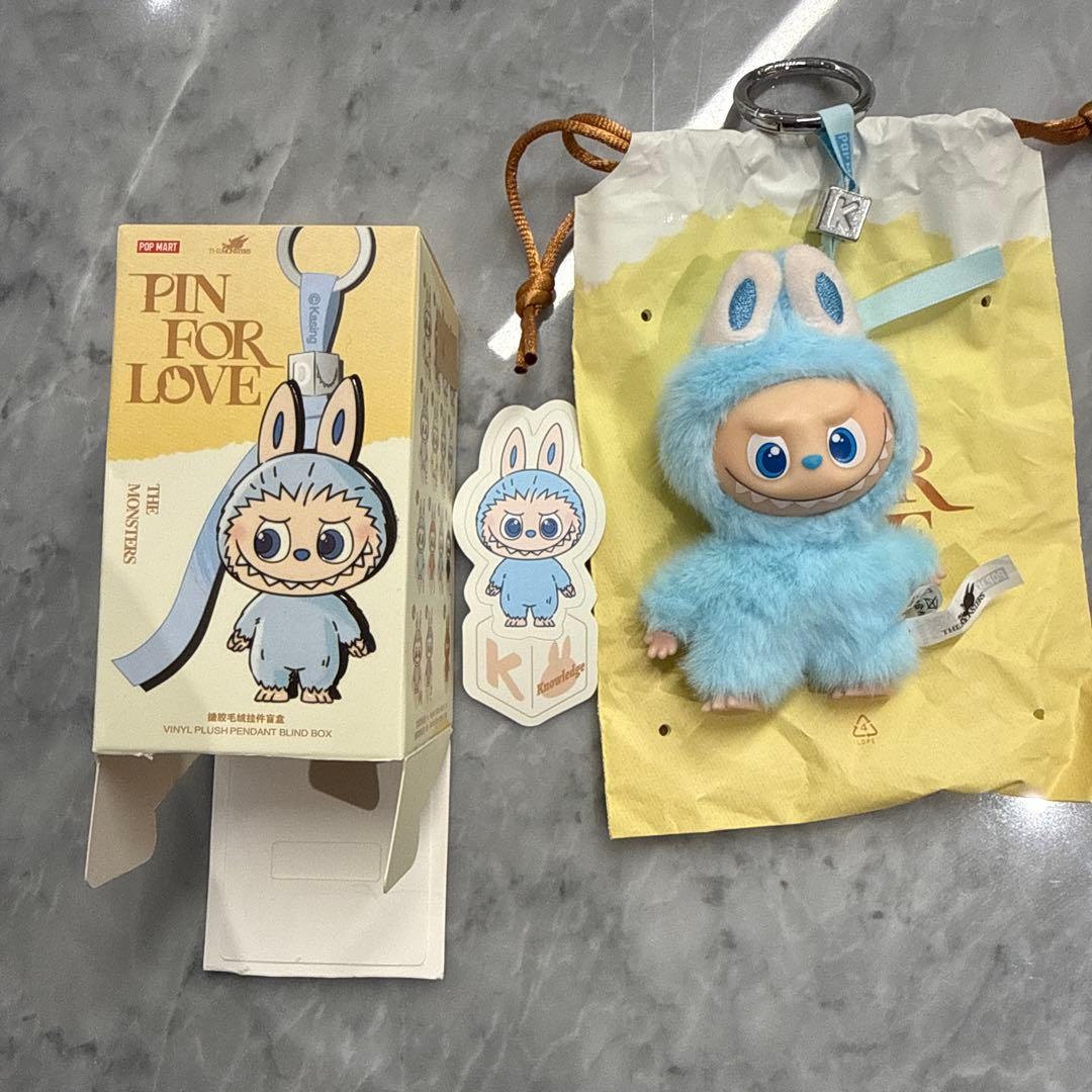 水色のファー素材のぬいぐるみ、KARLIDGEのPIN FOR LOVEシリーズ。