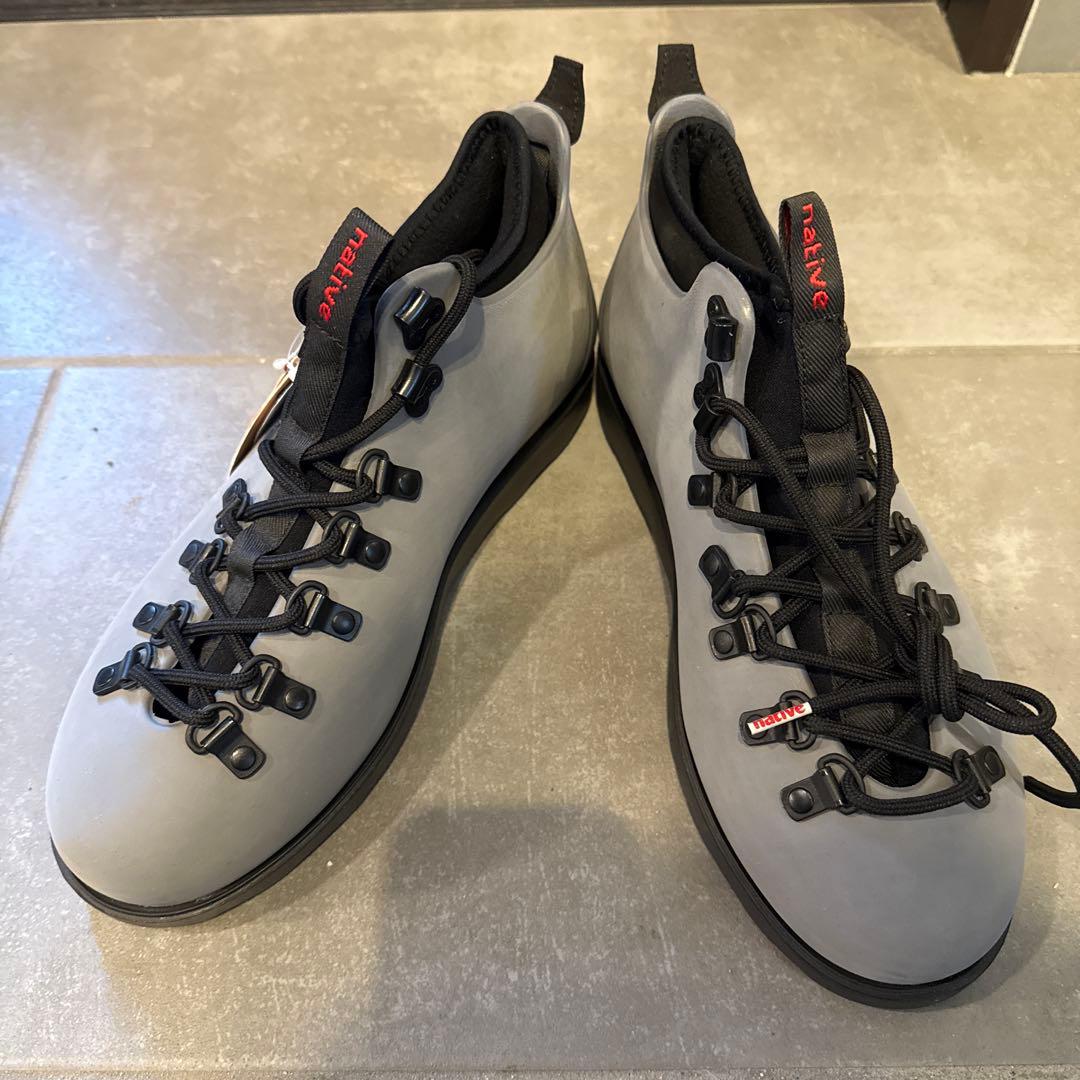 未使用品ですが、右踵のロゴが少し剥がれています耐水性のグレーのハイカットアウトドアシューズ。 サイズM9 - ブランド: native - 色: グレー - スタイル: ハイカット - 特徴: 耐水性 - 用途: アウトドア - ソール: ラバーソール ご覧いただきありがとうございます。