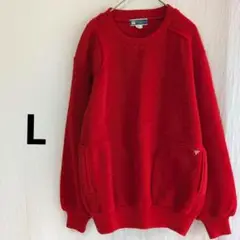 ストライプデザインと袖のエンブレム刺繍が特徴的な赤いニットセーター。