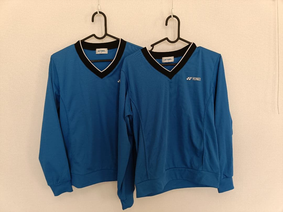 YONEXの青いVネック長袖ウェア、背面にボタン付きの2着セット。 - ブランド: YONEX - カラー: 青 - デザイン: Vネック - スタイル: 長袖 - 特徴: 背面にボタン付き - 数量: 2着セット ご覧いただきありがとうございます。 ゼッケンボタン付いてますので傷汚れアリにしました。それ以外は綺麗です。