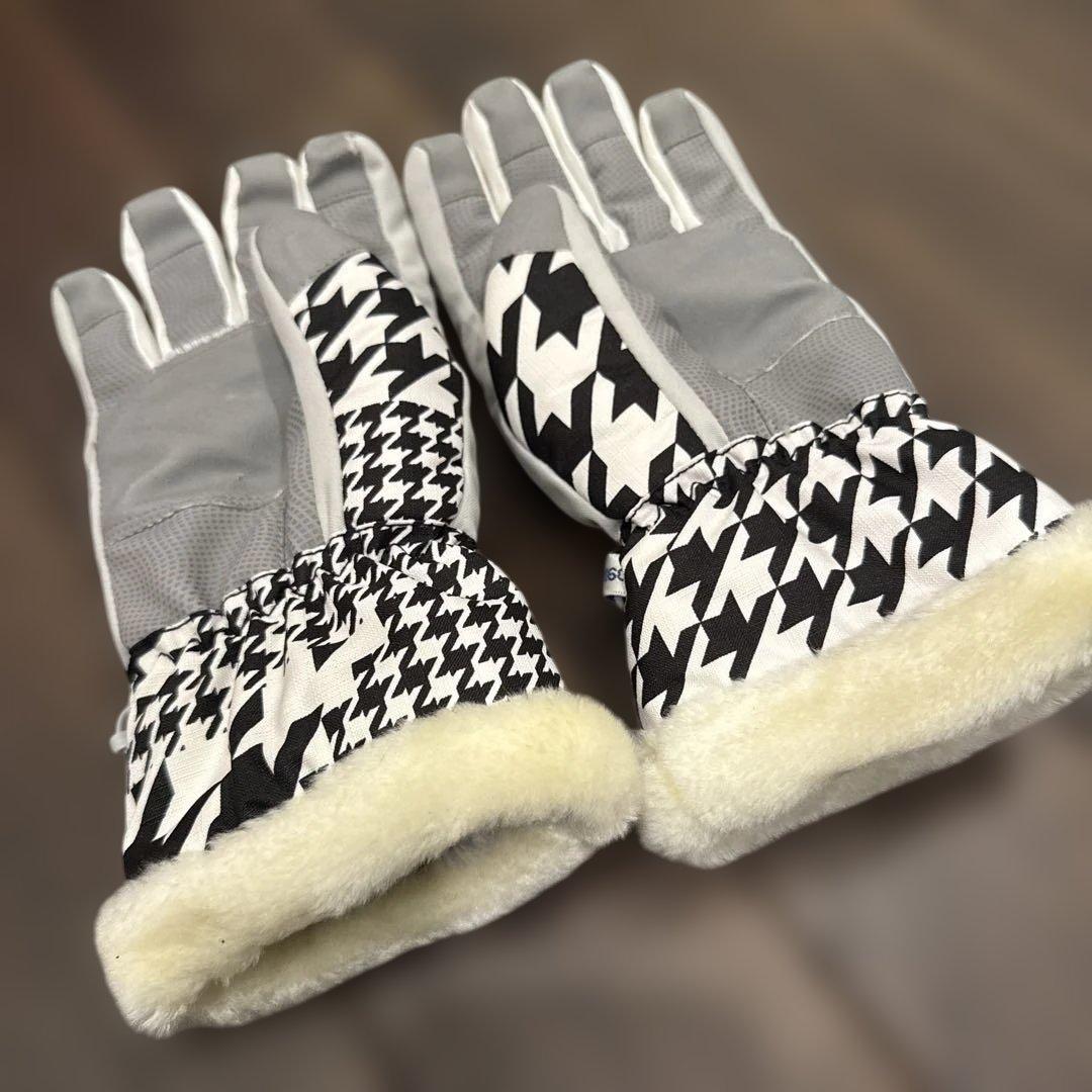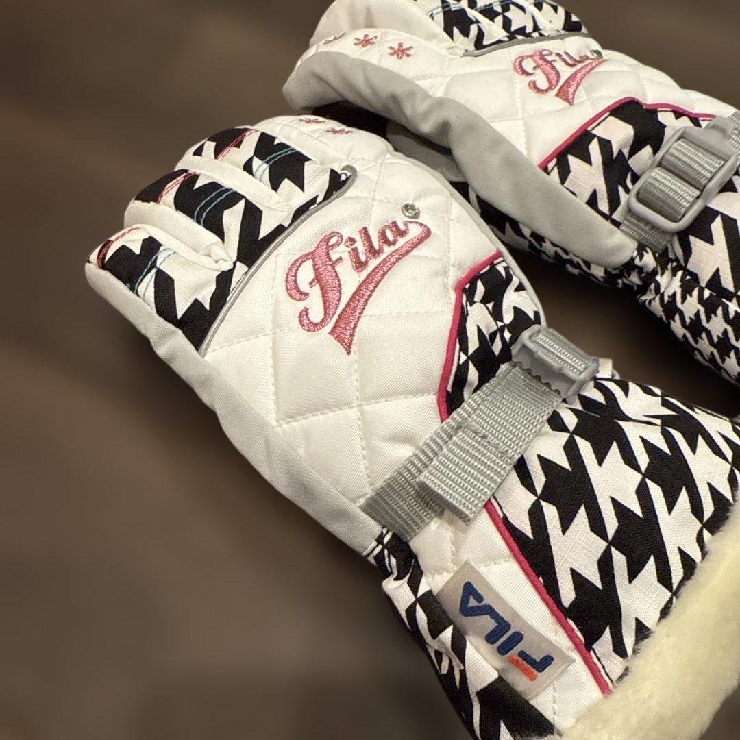 ハウンドトゥースパターンのデザインで、調整可能なストラップ付きのスキーグローブ。 - ブランド: Fila - デザイン: ハウンドトゥースパターン - 素材: 合成繊維、ファーライニング - 機能: 調整可能なストラップ - カラー: ホワイト、ブラック、グレー ご覧いただきありがとうございます。 160cmサイズになります。