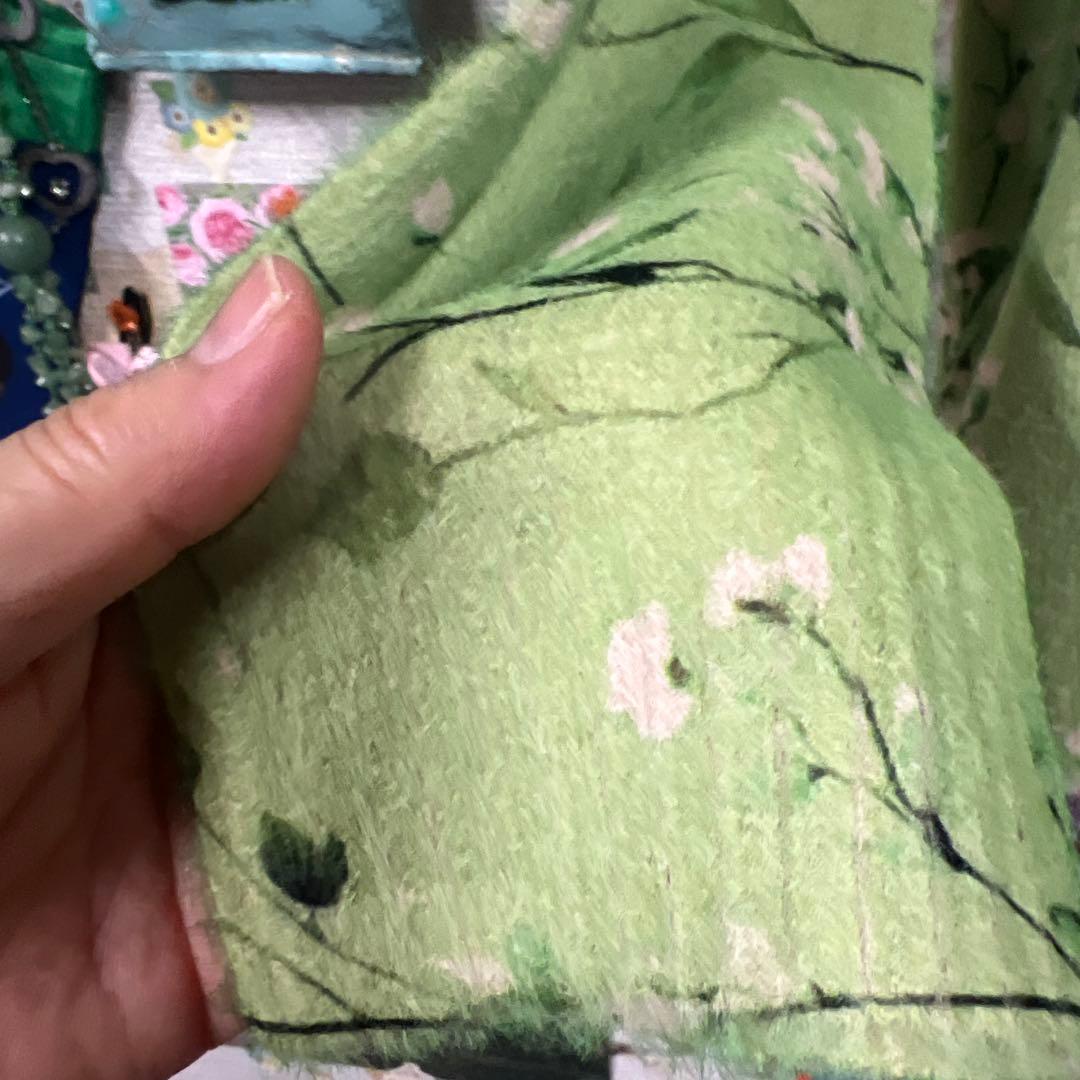 ☆花柄デザインのグリーンニットチュニック、クルーネック仕様