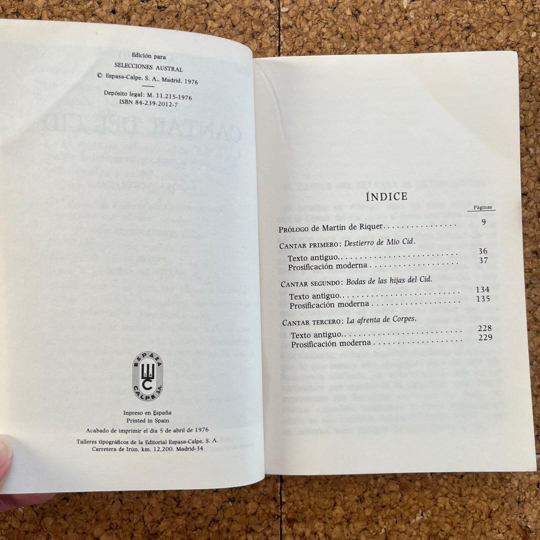 Cantar del Cid シッドの歌 約50年前に購入したEspasa-Calpsa 社出版の中世スペインの叙事詩 「Cantar del Mio Cid」」です。 全てスペイン語です。 表紙の汚れや紙は変色などありますが、中身は書き込みや目立つ汚れはないです。 ペーパーバックの中古品ということをご理解の上、ご検討ください。 こちらは隣市の実家にあるため、1週間以内の発送となりますのでご注意ください。 お急ぎの方は事前にご連絡をお願いします。 即購入可