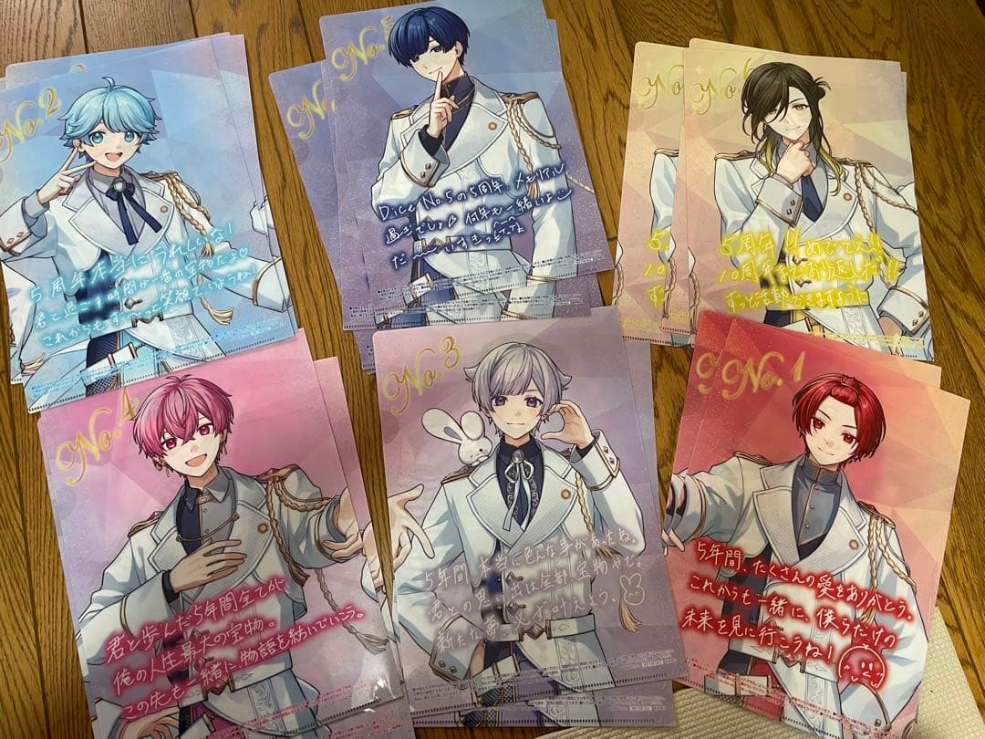ファミマ限定‼ 多色イラストが魅力のクリアファイルセット。 - デザイン: キャラクターイラスト6枚セット - 色: 多色 - 番号: No.1からNo.6まで番号付き - 特徴: 各キャラクターに異なる衣装とポーズ