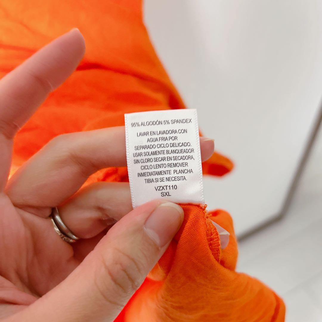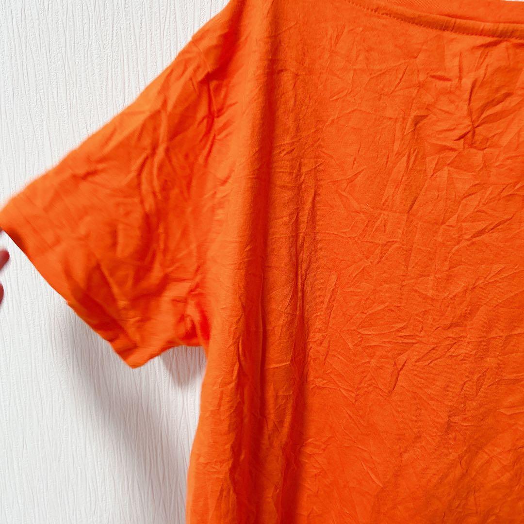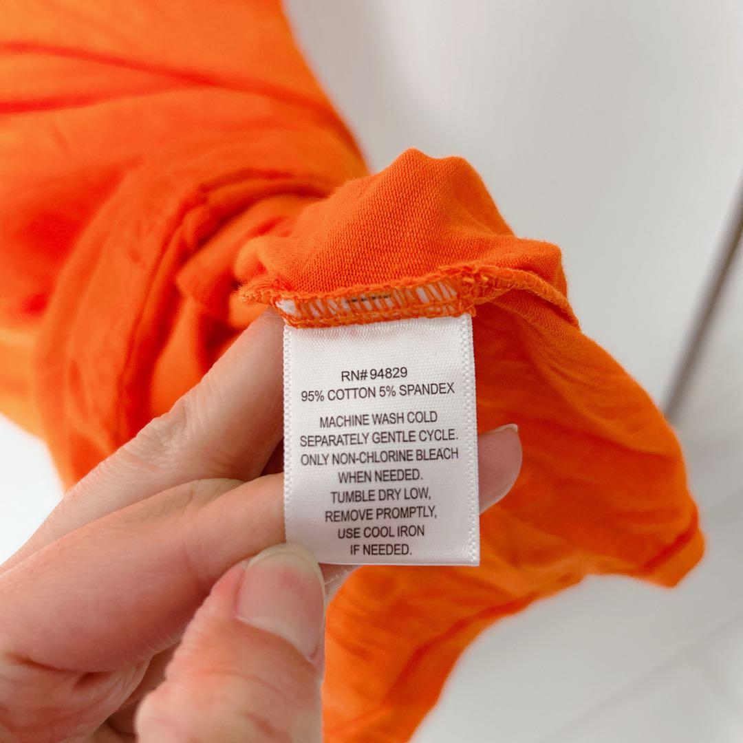95%コットンと5%スパンデックスのオレンジTシャツ、快適な着心地。写真で撮ったのですが、写らないくらい、うすく色移りの跡があります。内側なので気にならないかと思います!